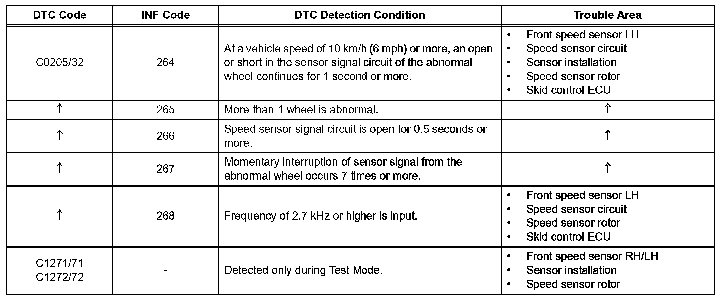 - DTCs C0205/32 and C1272/72 are for the front speed sensor LH.