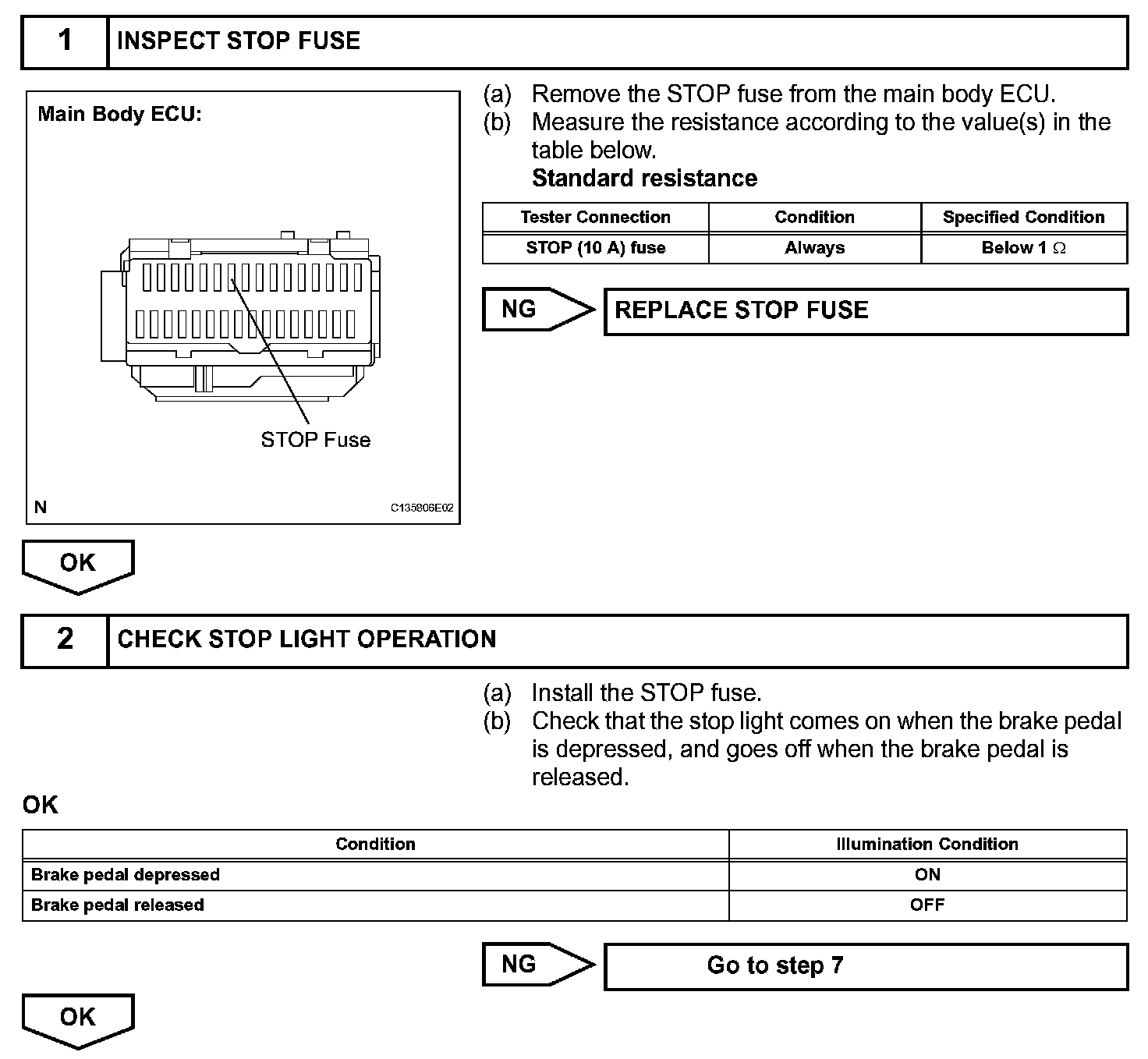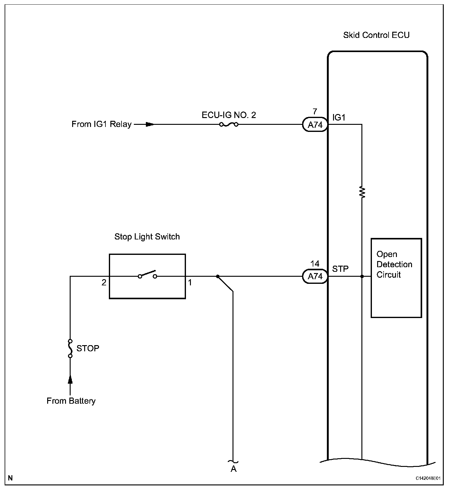 The skid control ECU has an open detection circuit, which outputs this DTC when detecting an open in the stop light input line while the stop light switch is OFF.