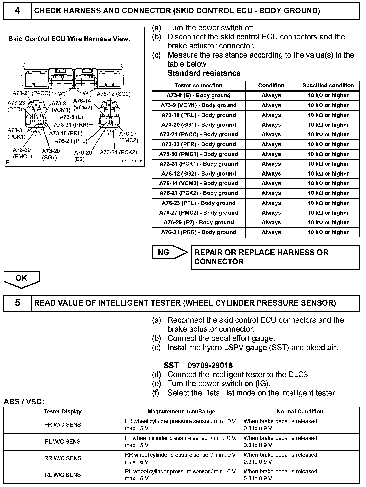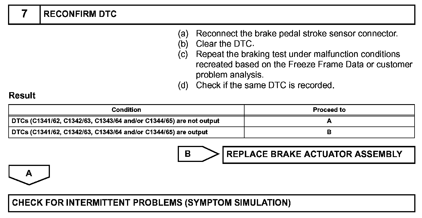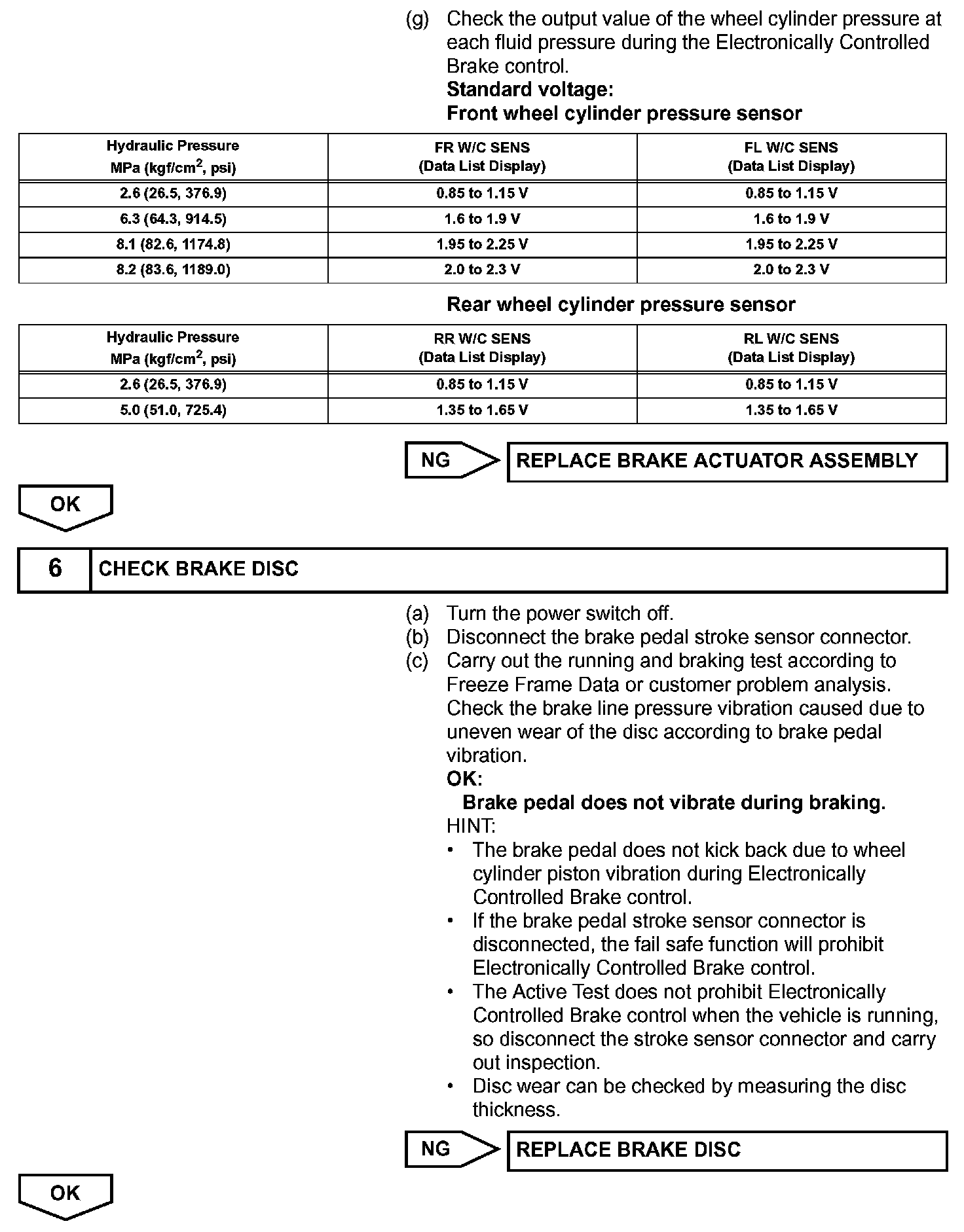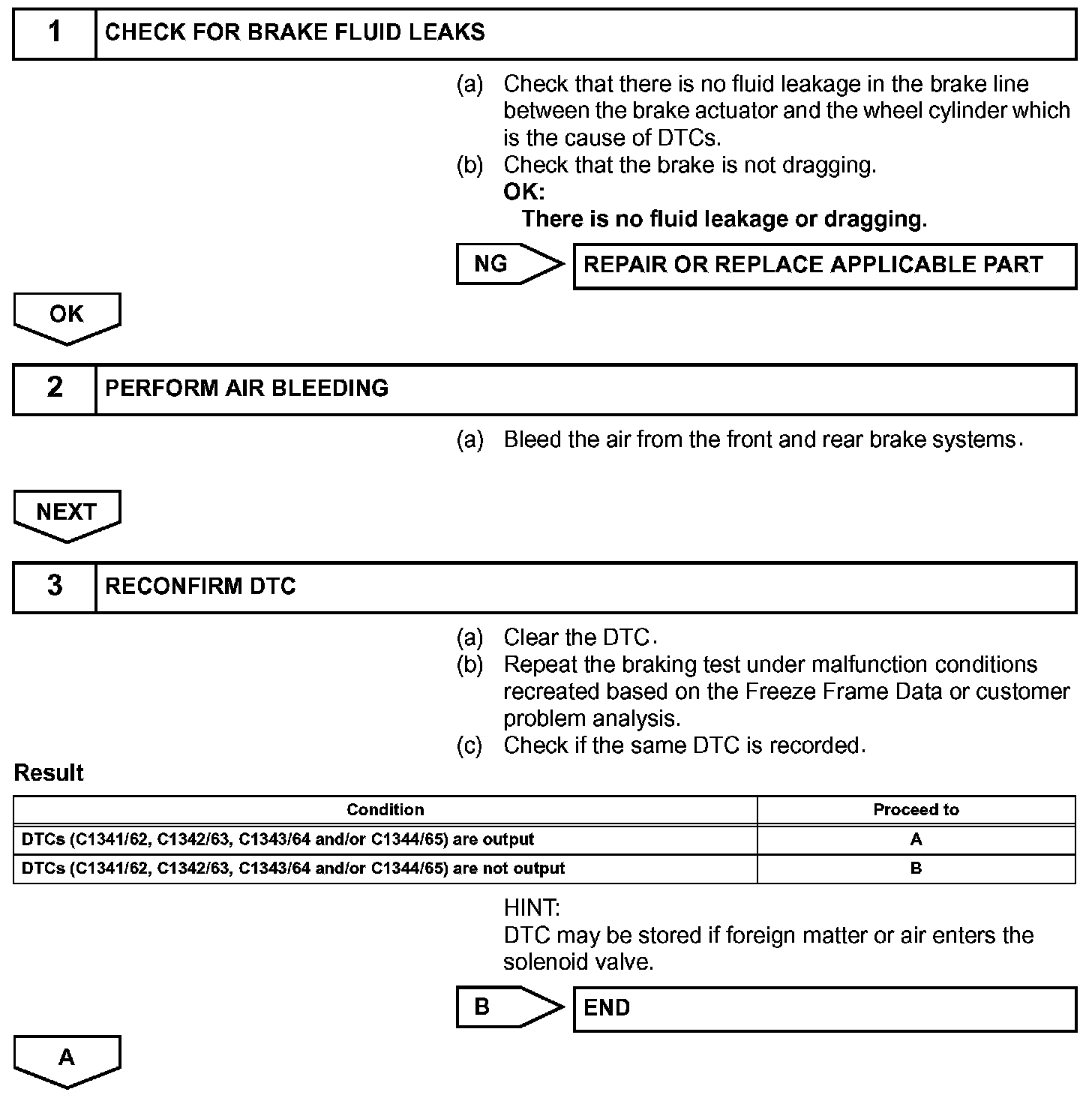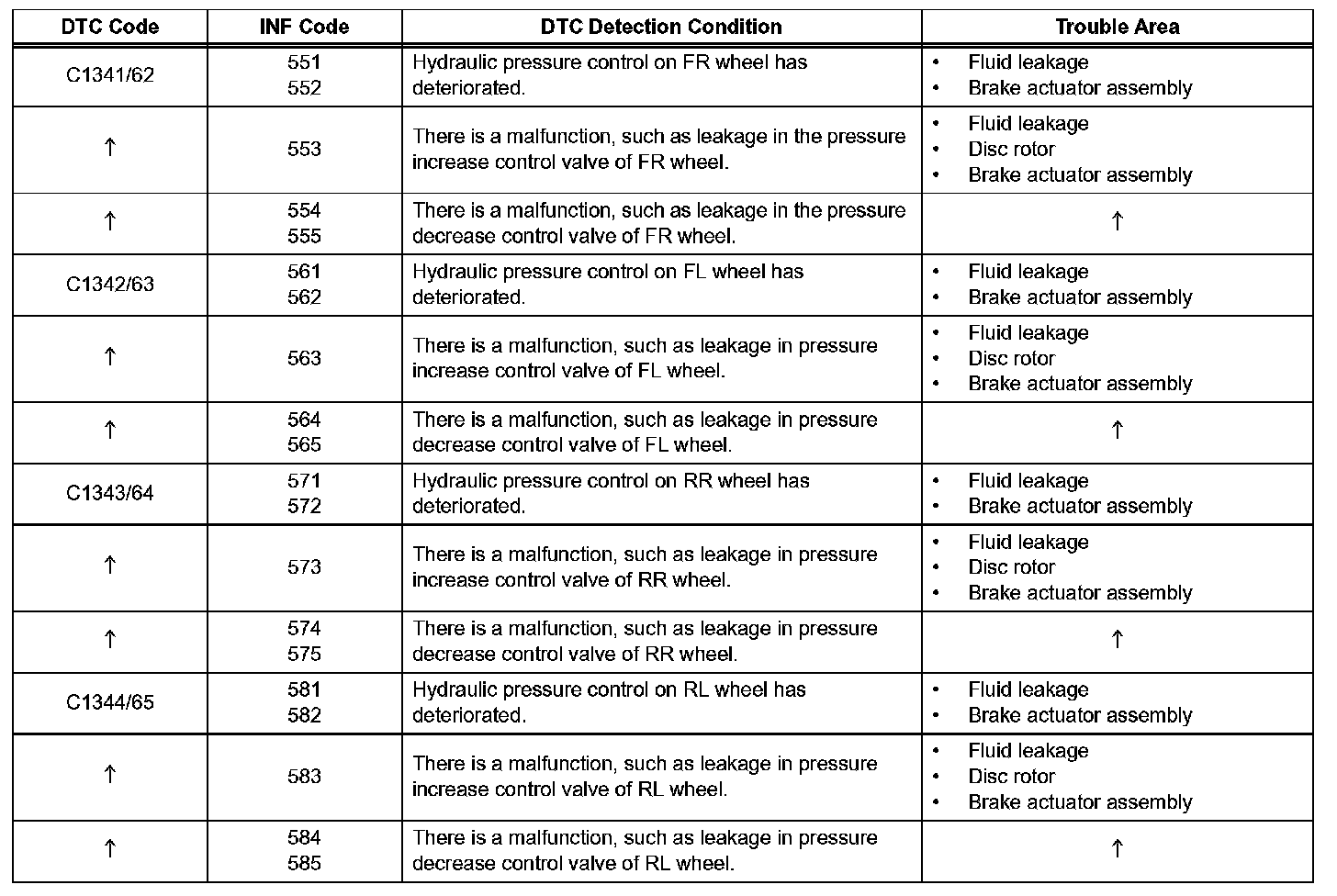 DTCs may be stored if brake fluid leaks, the wheel cylinder vibrates due to uneven wear of the brake disc rotor, or foreign matter enters the solenoid valve.