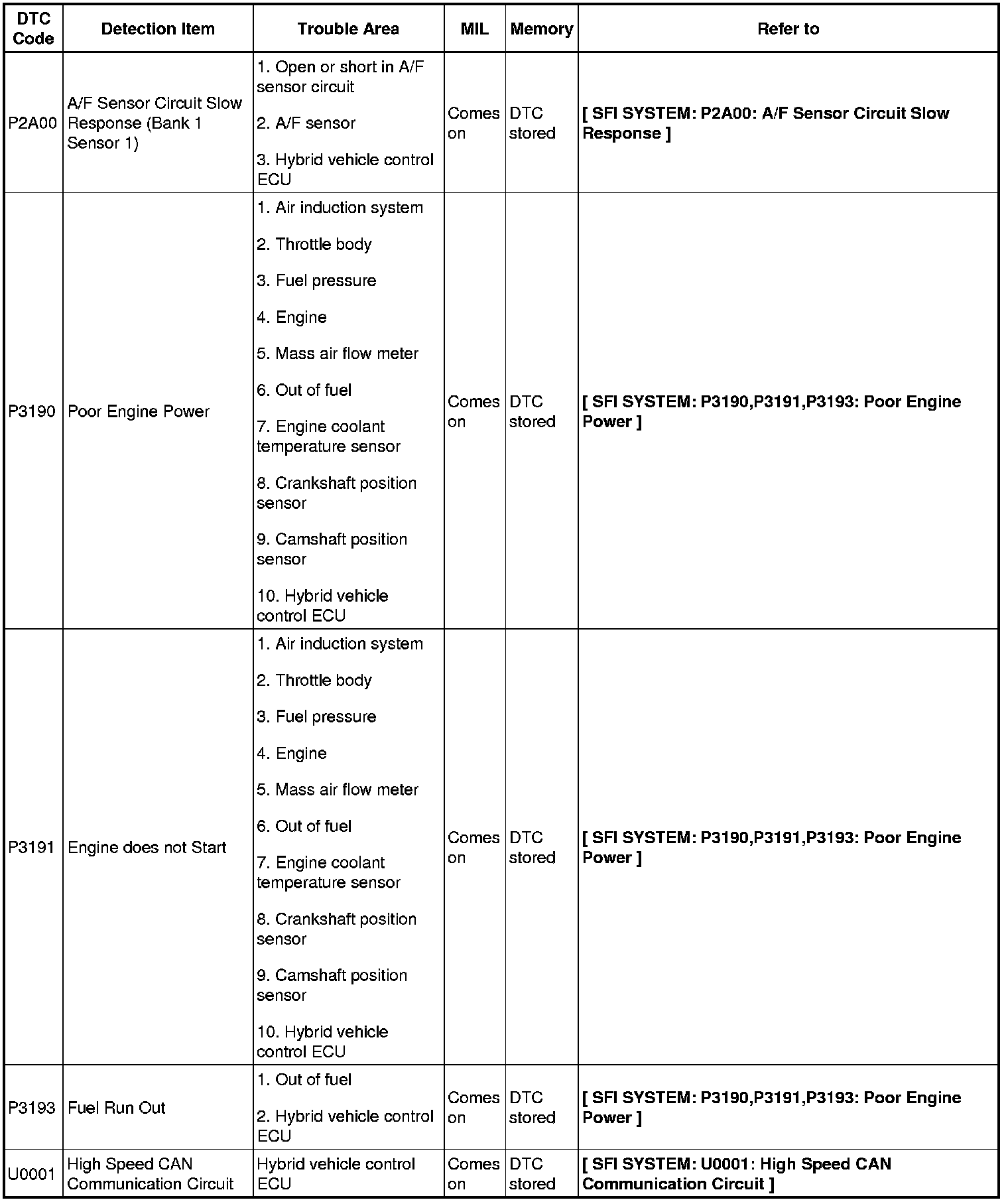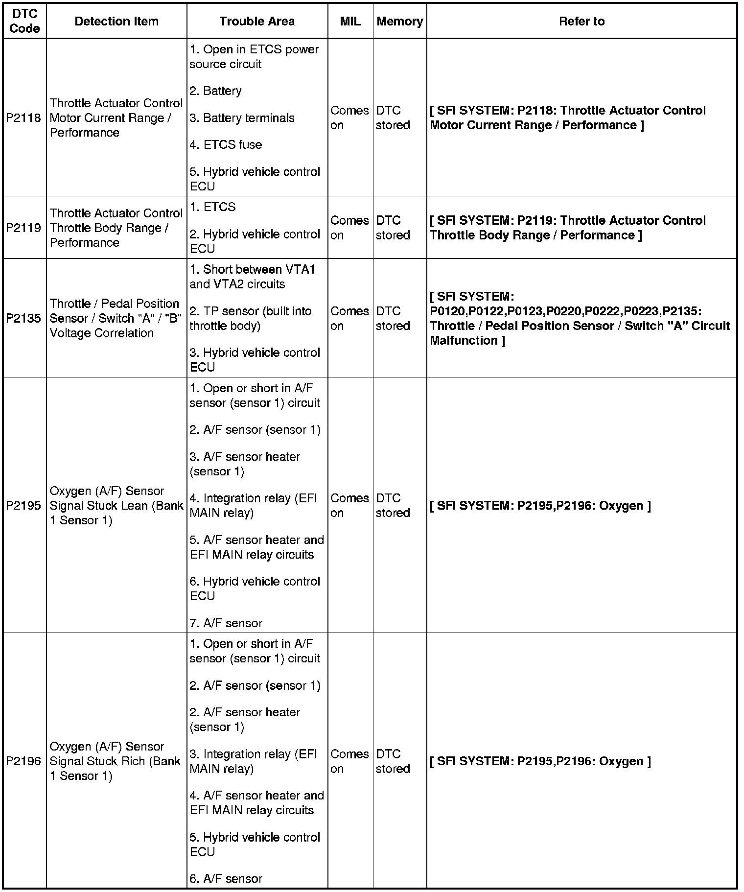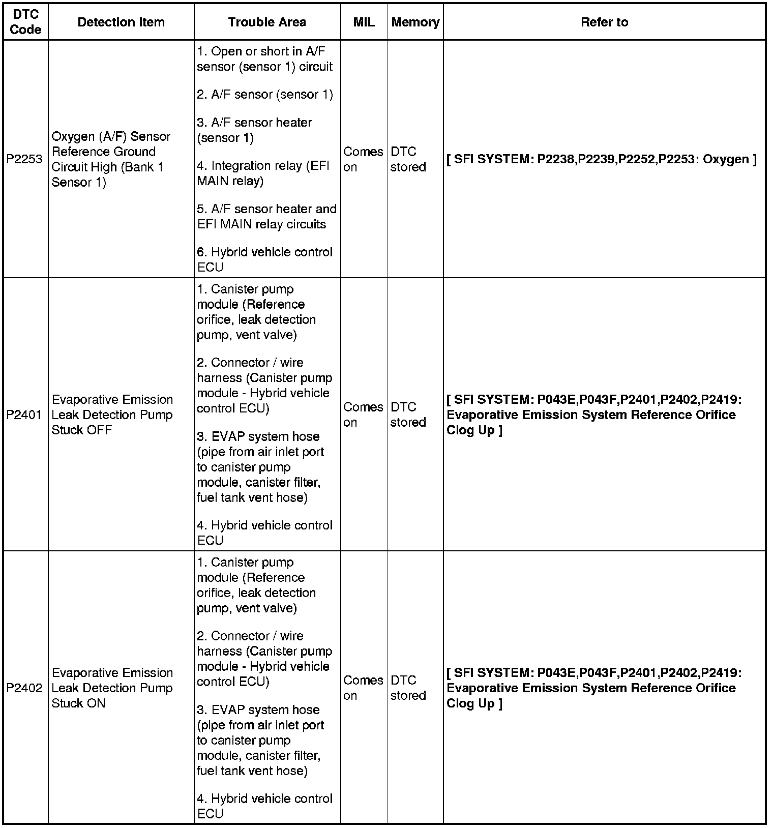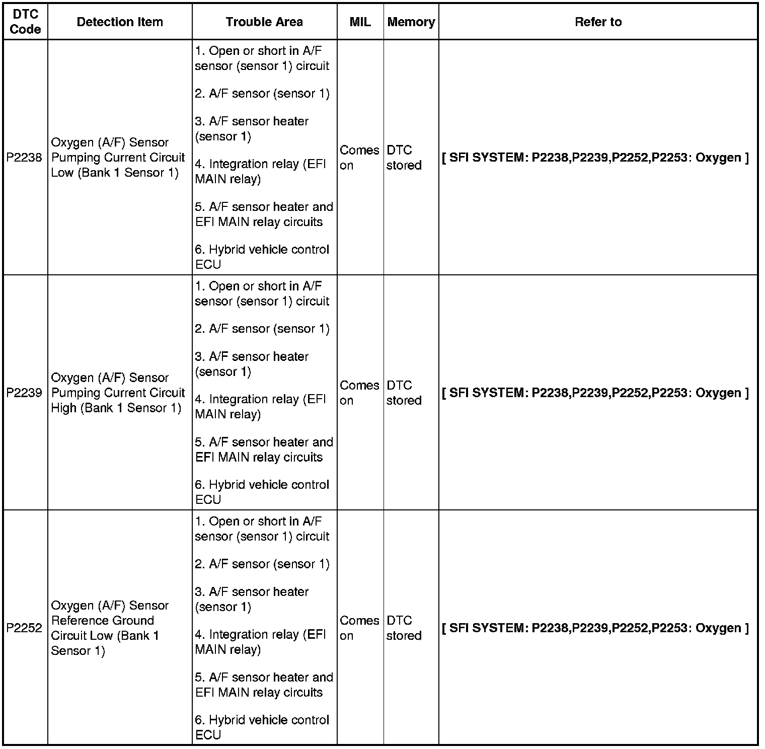 2AZ-FXE ENGINE CONTROL SYSTEM: SFI SYSTEM: DIAGNOSTIC TROUBLE CODE CHART