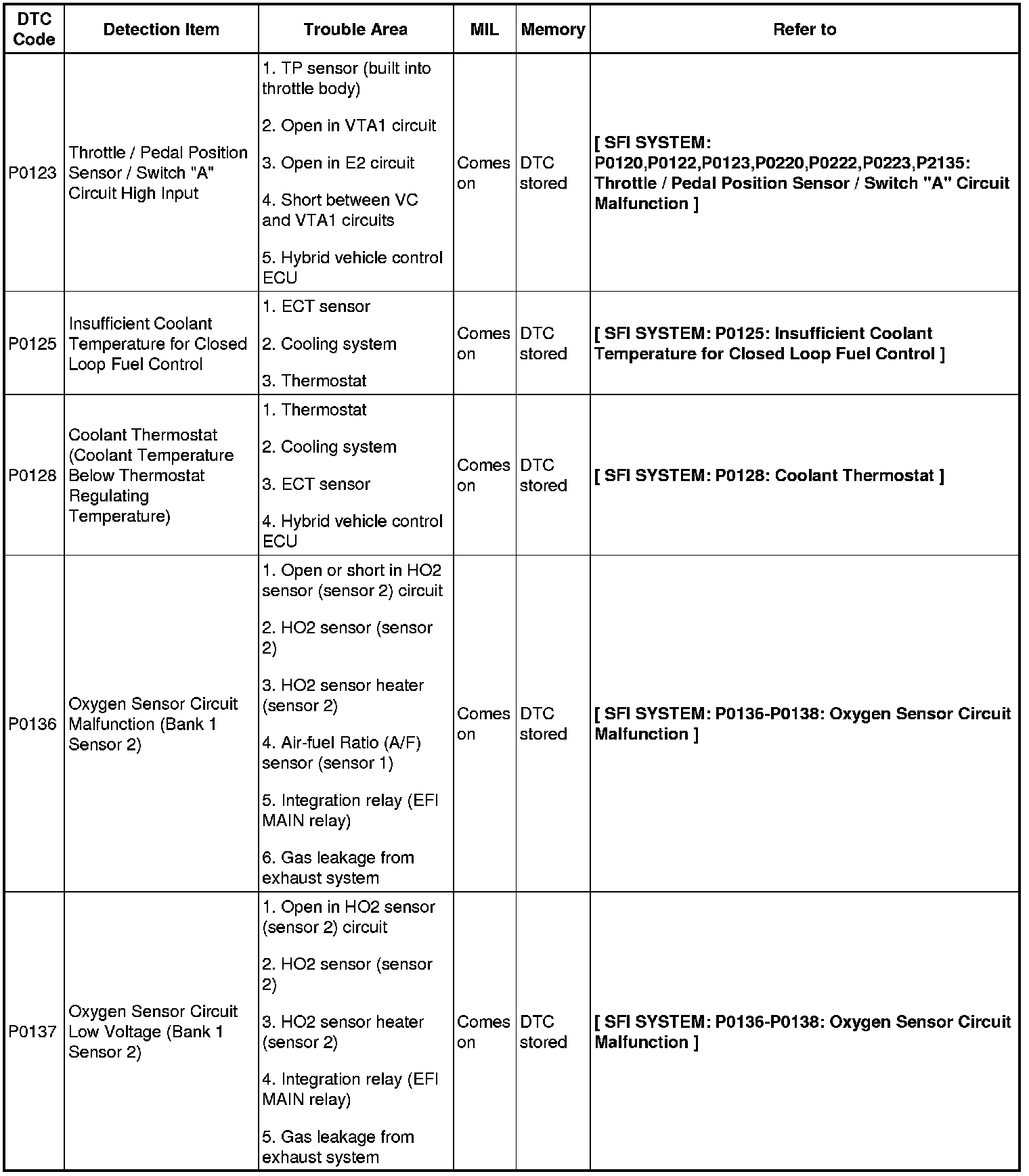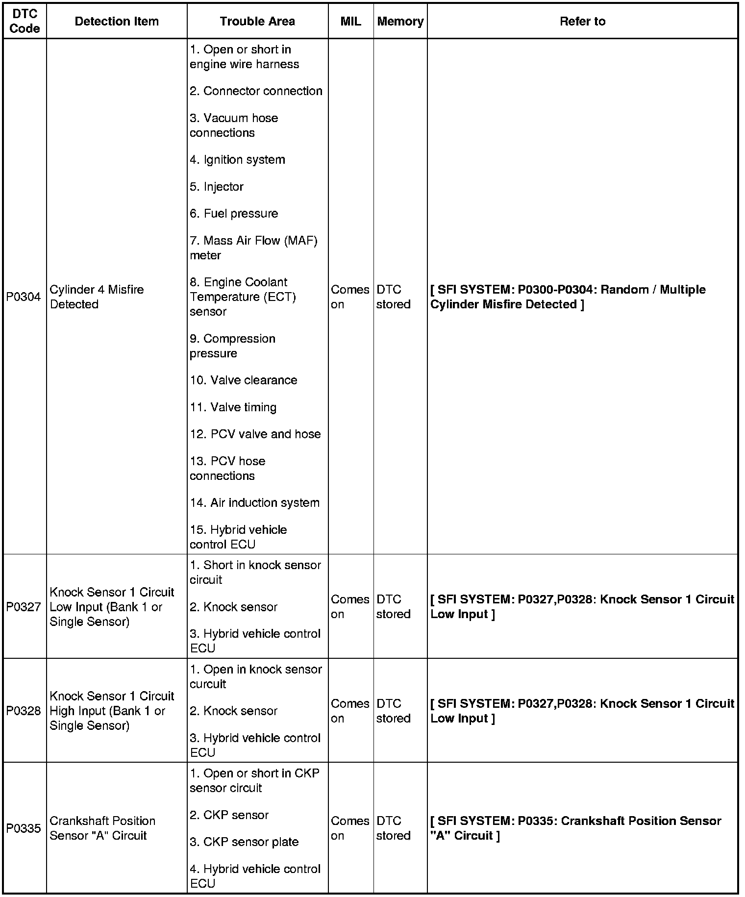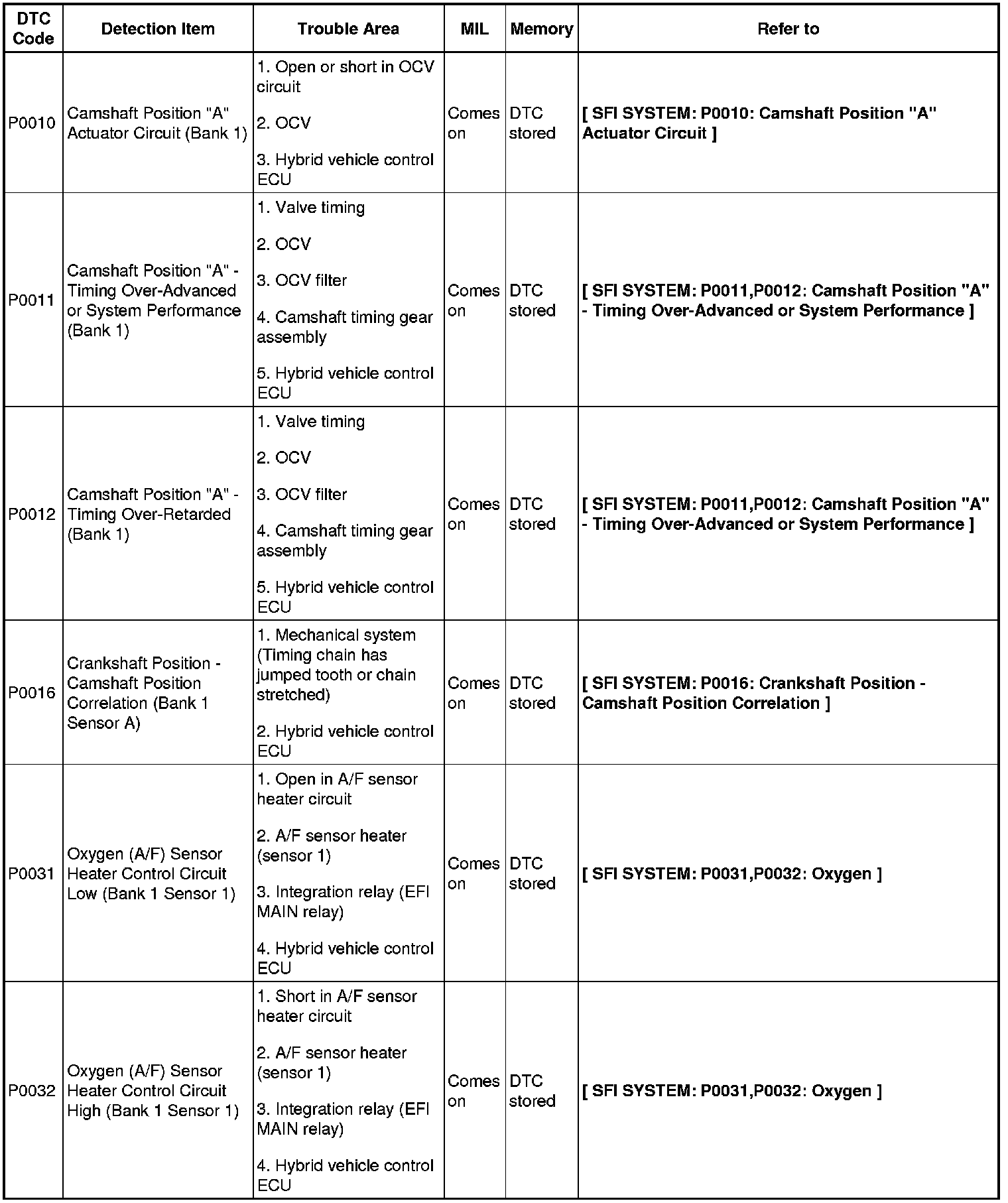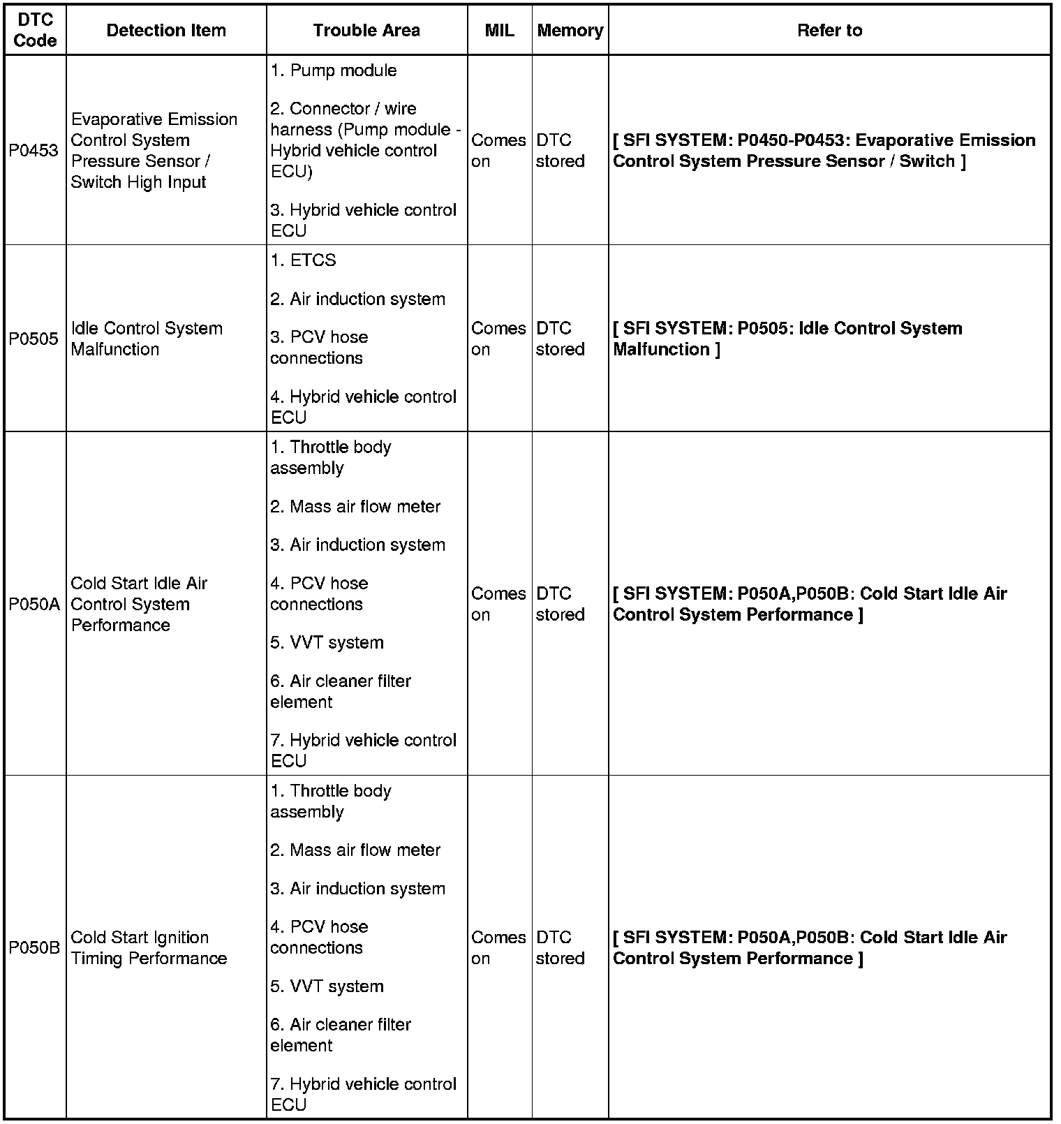 2AZ-FXE ENGINE CONTROL SYSTEM: SFI SYSTEM: DIAGNOSTIC TROUBLE CODE CHART