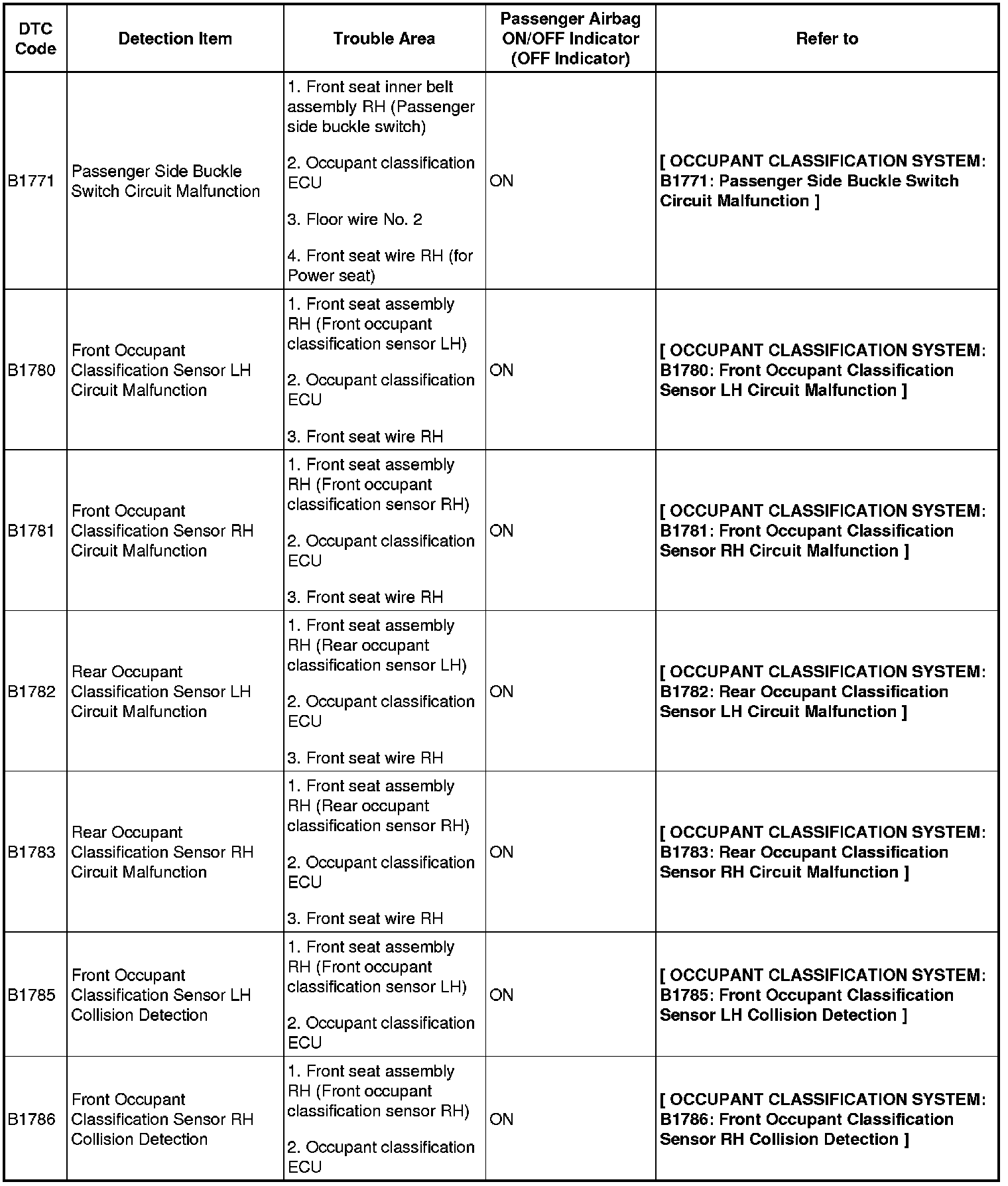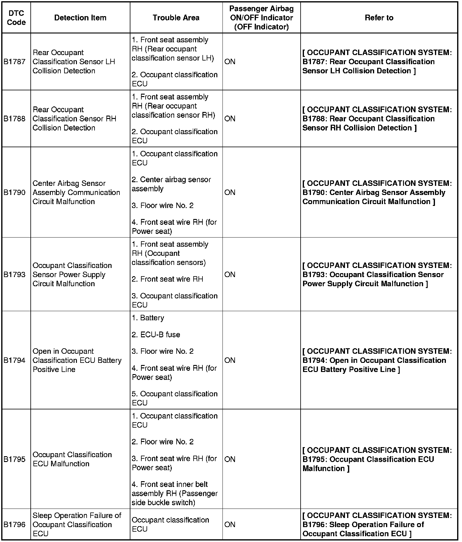 SUPPLEMENTAL RESTRAINT SYSTEM: OCCUPANT CLASSIFICATION SYSTEM: DIAGNOSTIC TROUBLE CODE CHART