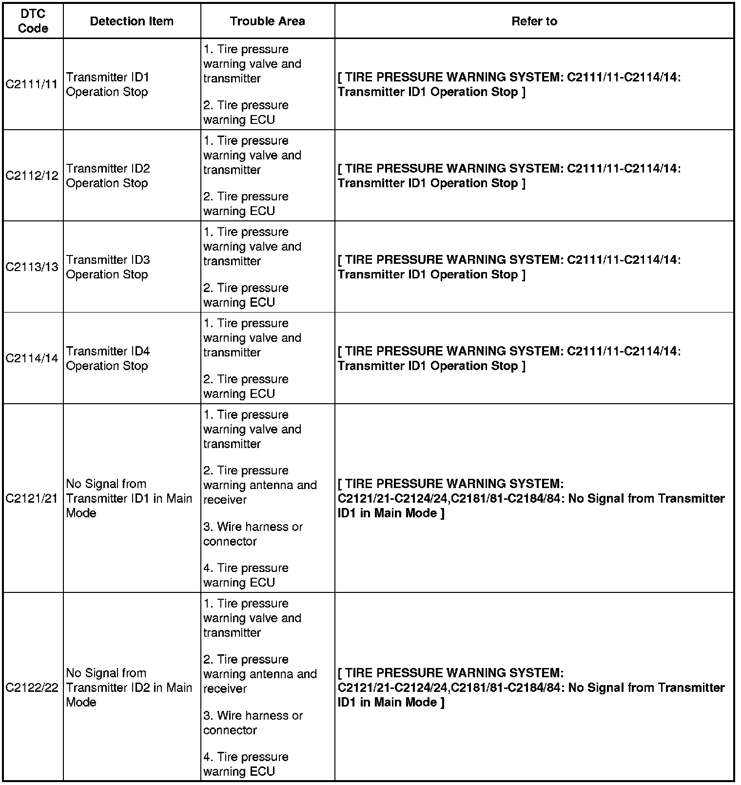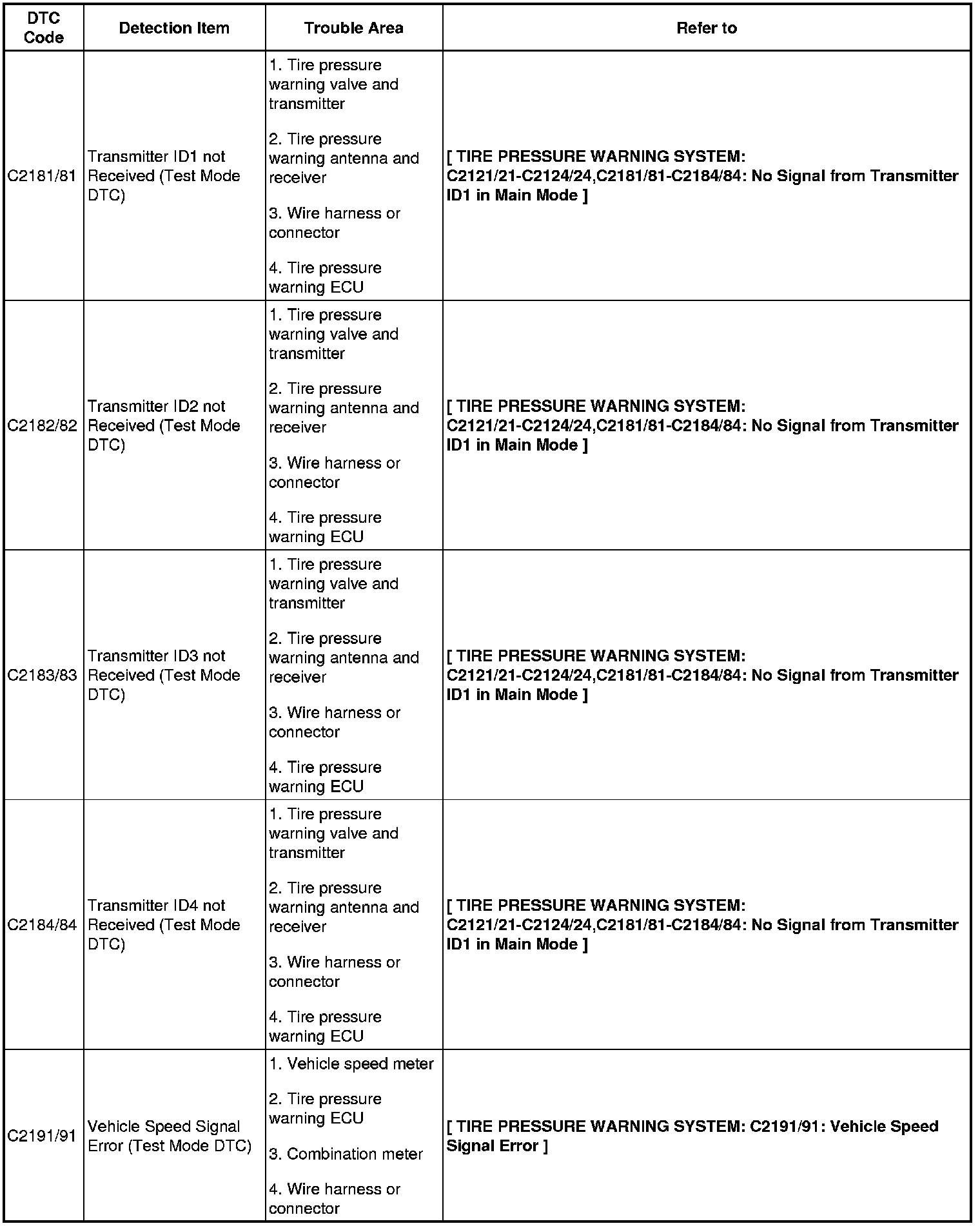TIRE AND WHEEL: TIRE PRESSURE WARNING SYSTEM: DIAGNOSTIC TROUBLE CODE CHART
