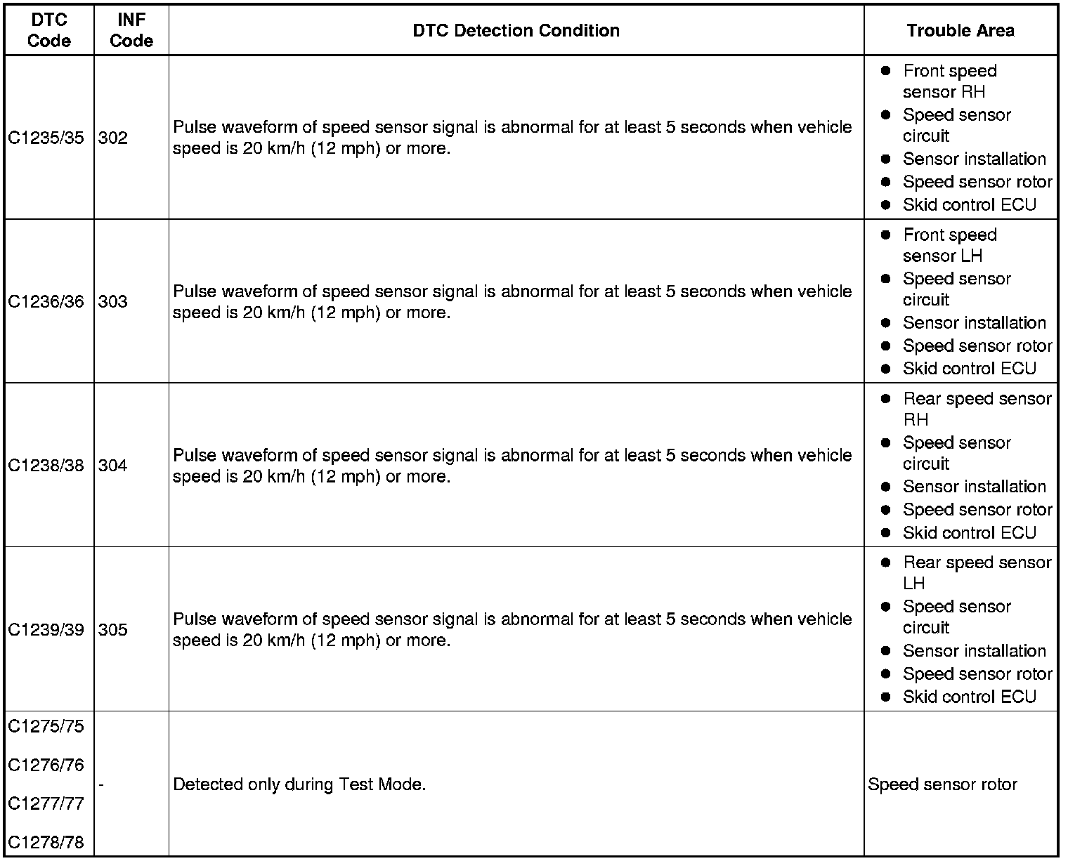 DTC C1278/78 - Abnormal Change in Output Signal of Rear Speed Sensor LH (Test Mode DTC)