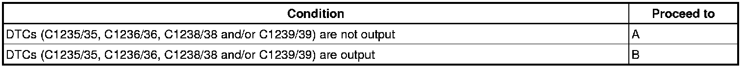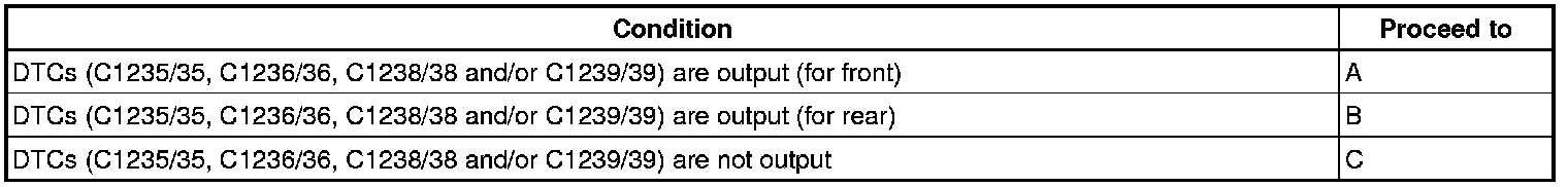 HINT: When C0200/31, C0205/32, C0210/33, or C0215/34 is output together with C1235/35, C1236/36, C1238/38, or C1239/39, inspect and repair the trouble areas indicated by C0200/31, C0205/32, C0210/33, or C0215/34 first.