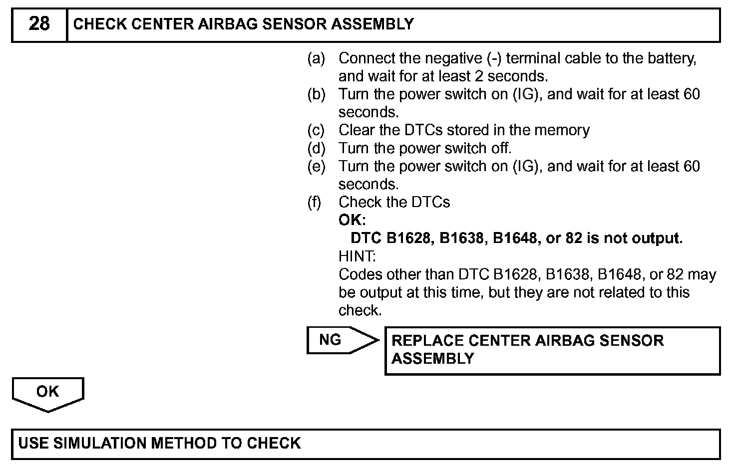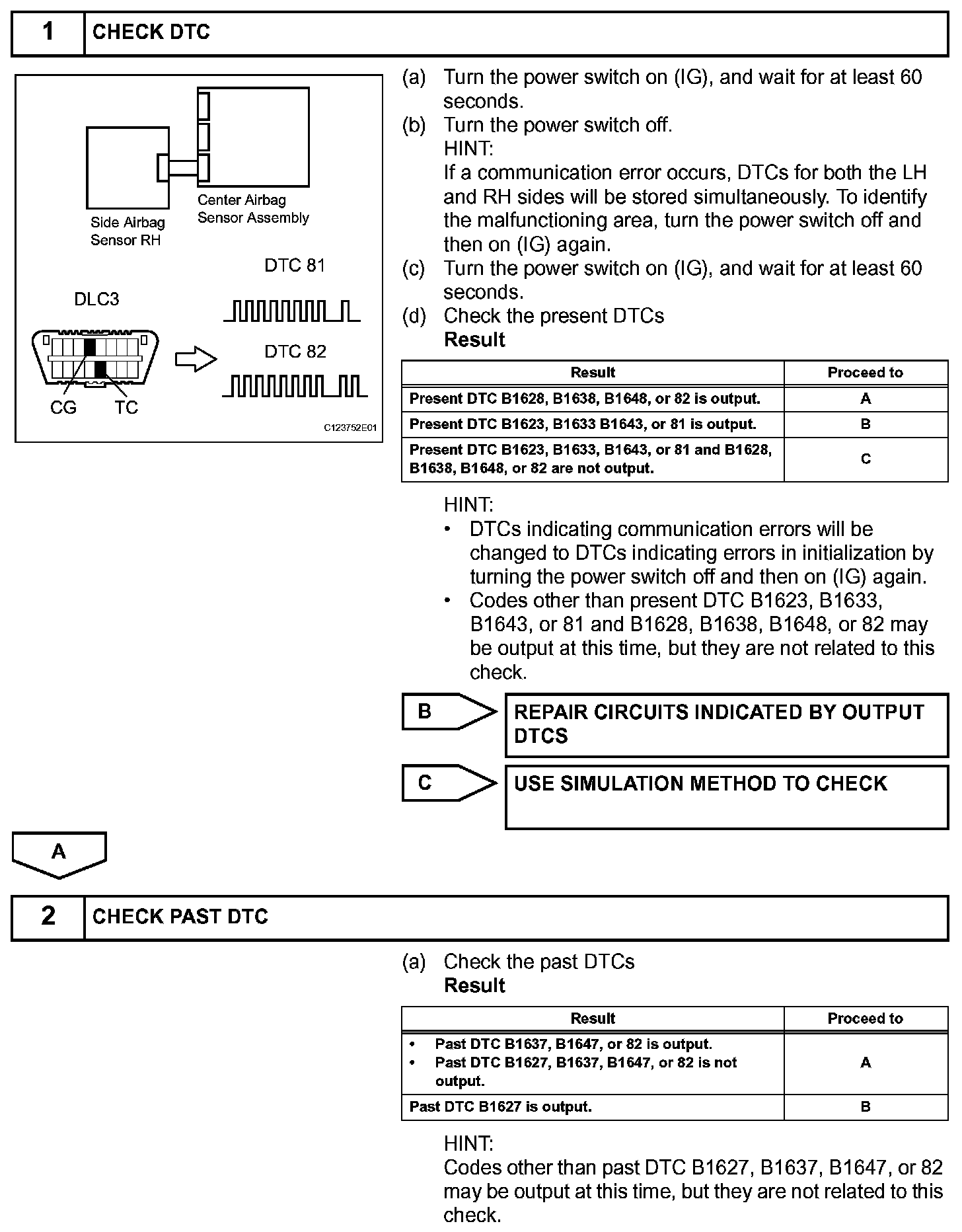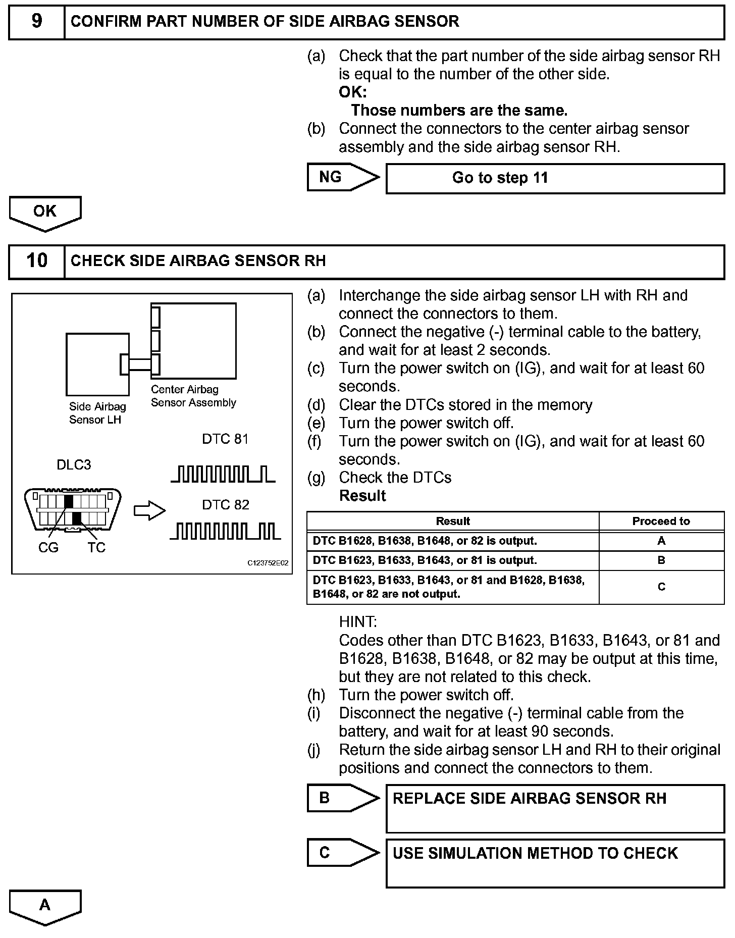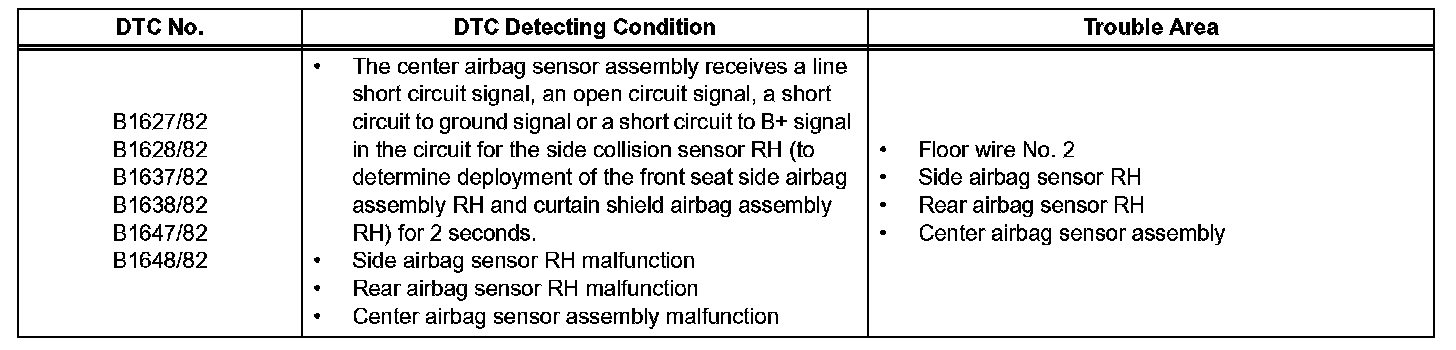 DTC B1627/82, B1628/82, B1637/82, B1638/82, B1647/82, or B1648/82 is recorded when a malfunction is detected in the circuit for the side collision sensor RH (to determine deployment of the front seat side airbag assembly RH and curtain shield airbag assembly RH).