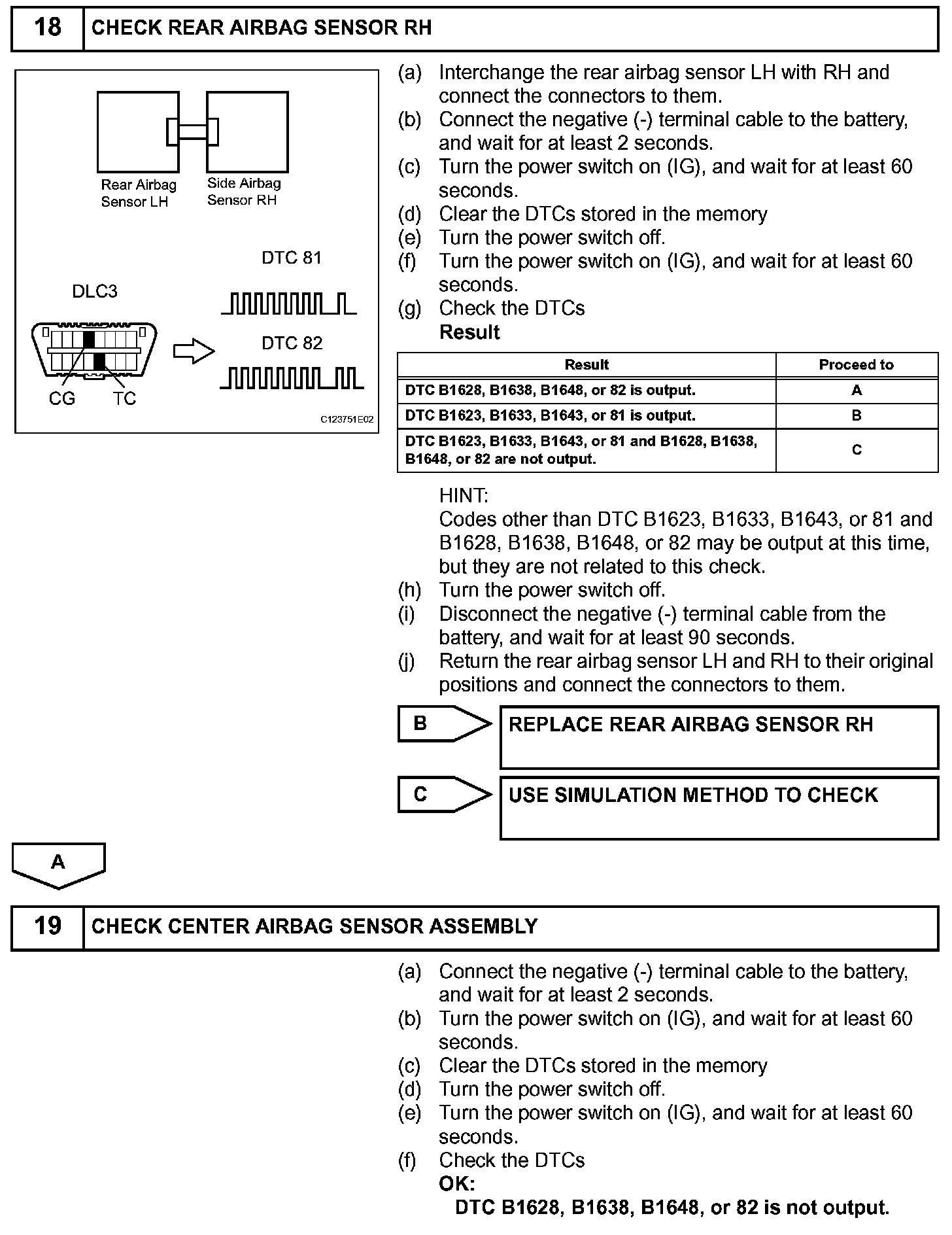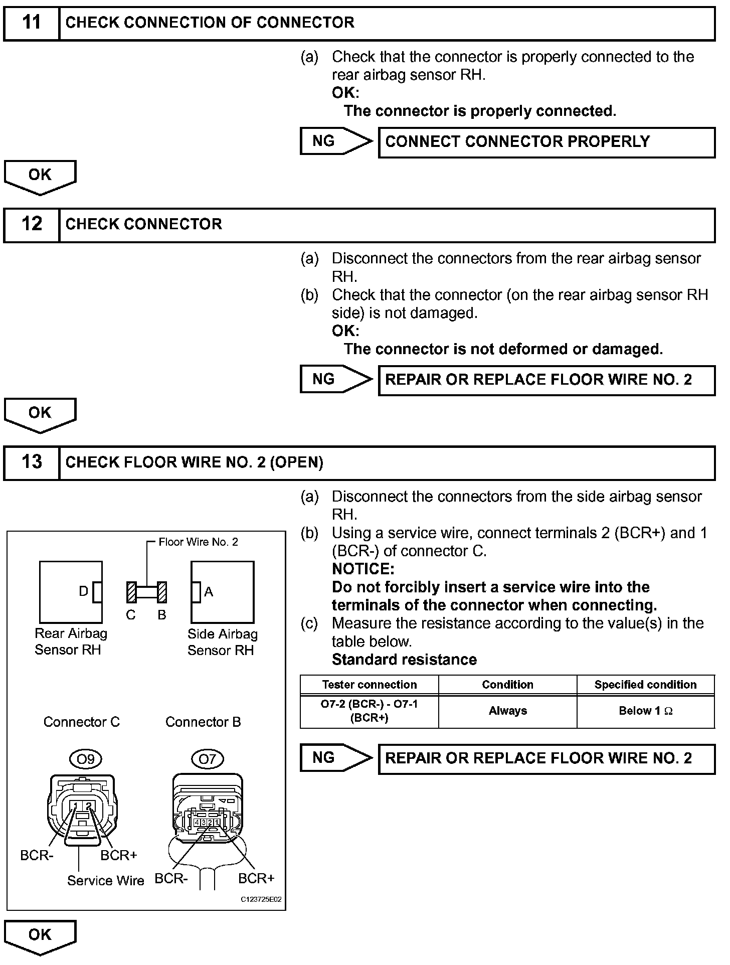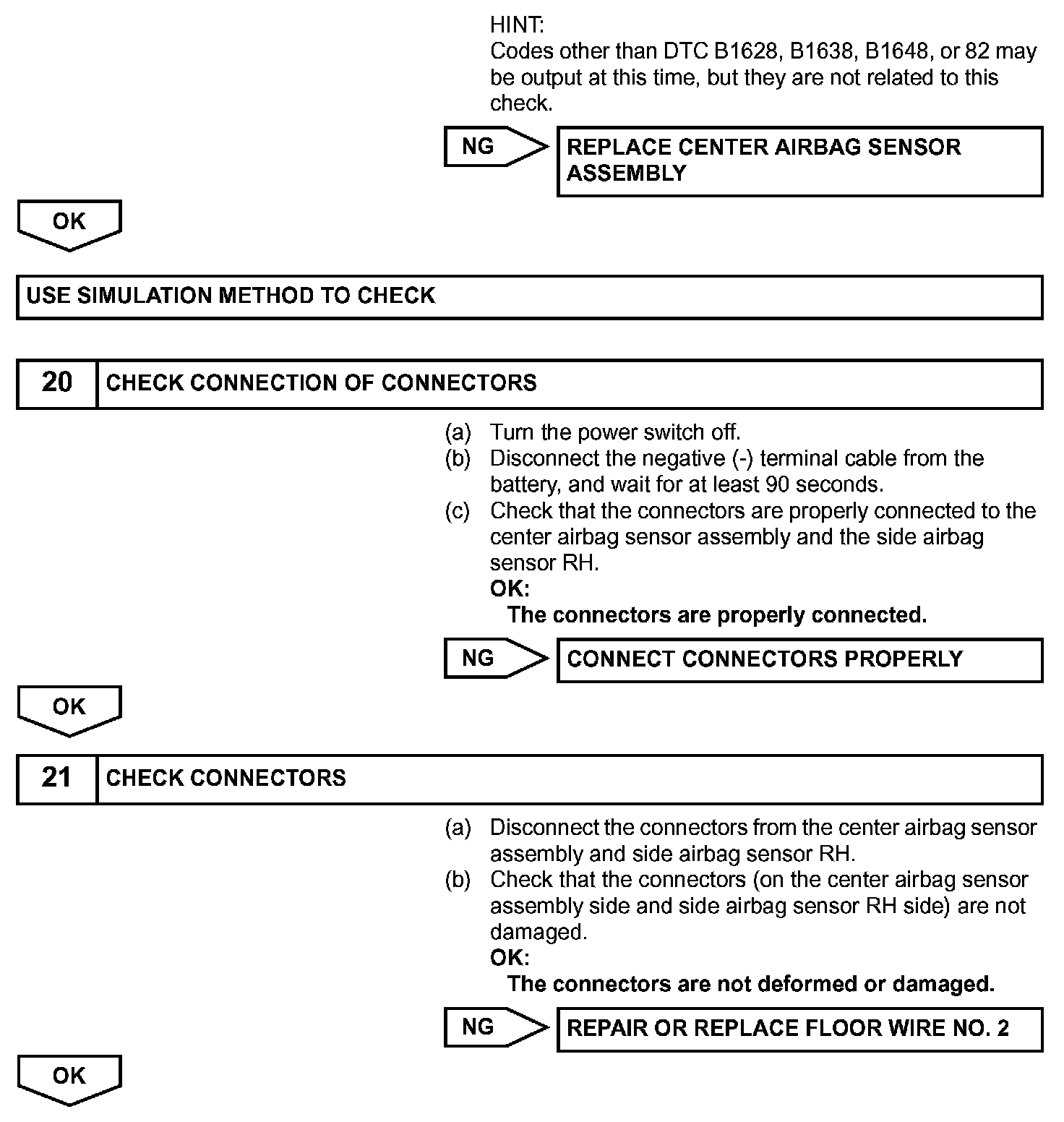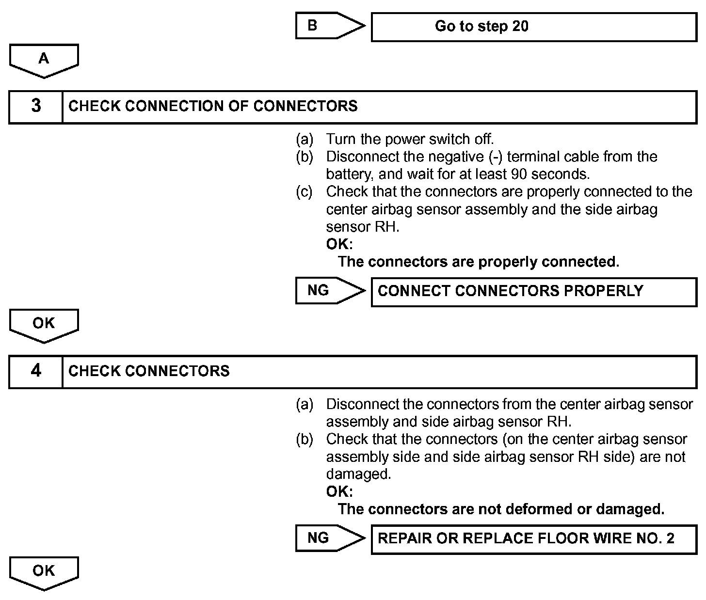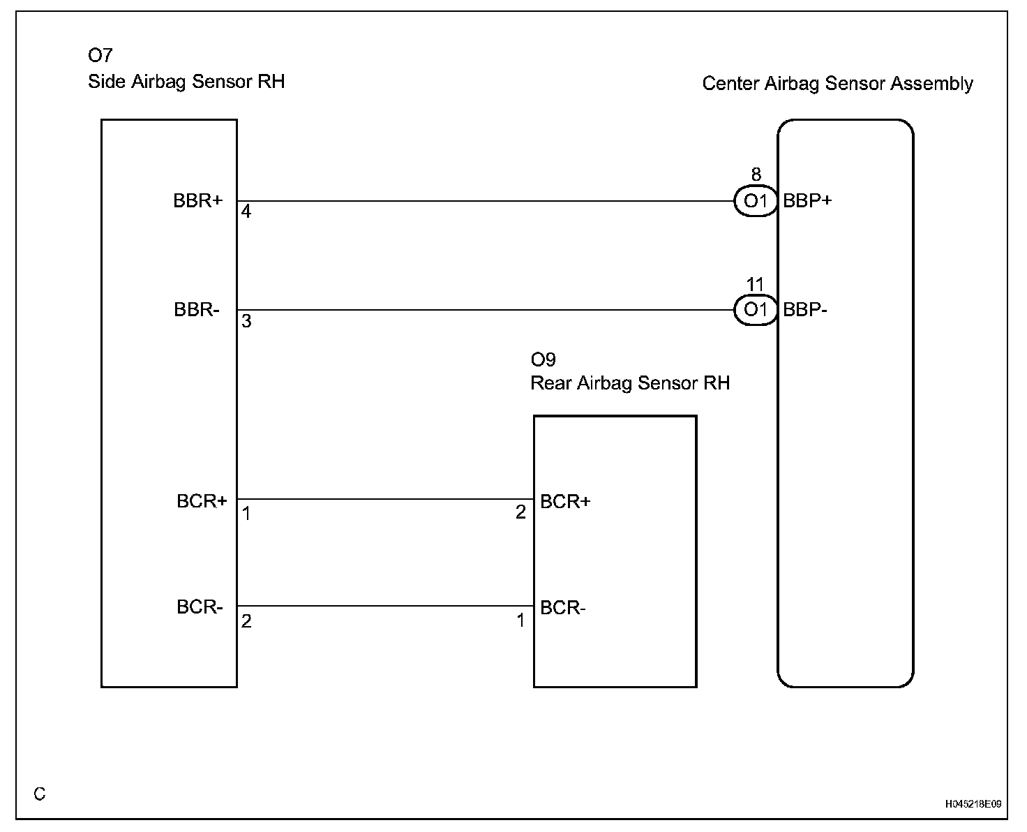 The circuit for the side collision sensor RH (to determine deployment of the front seat side airbag assembly RH and curtain shield airbag assembly RH) is composed of the center airbag sensor assembly, side airbag sensor RH, and rear airbag sensor RH.