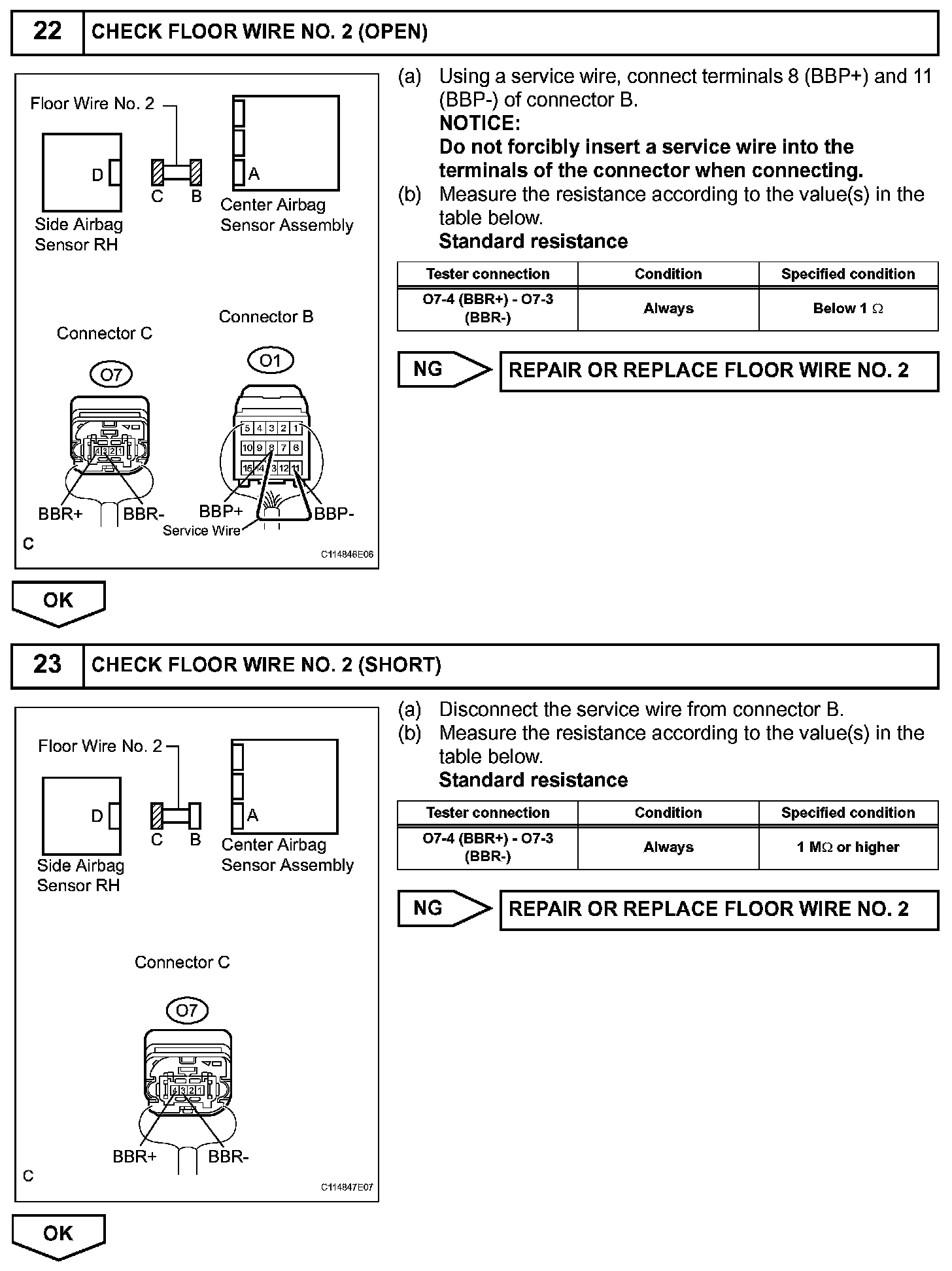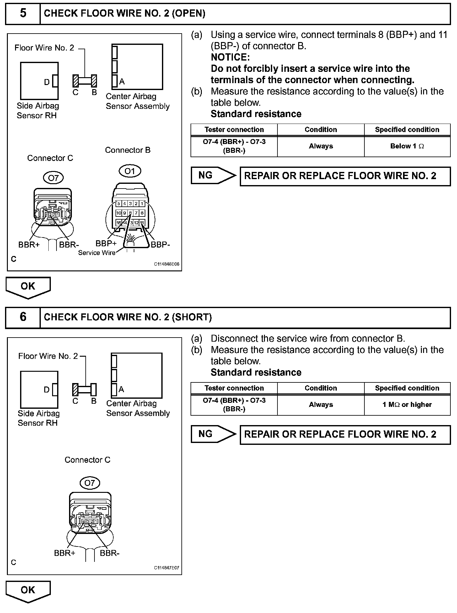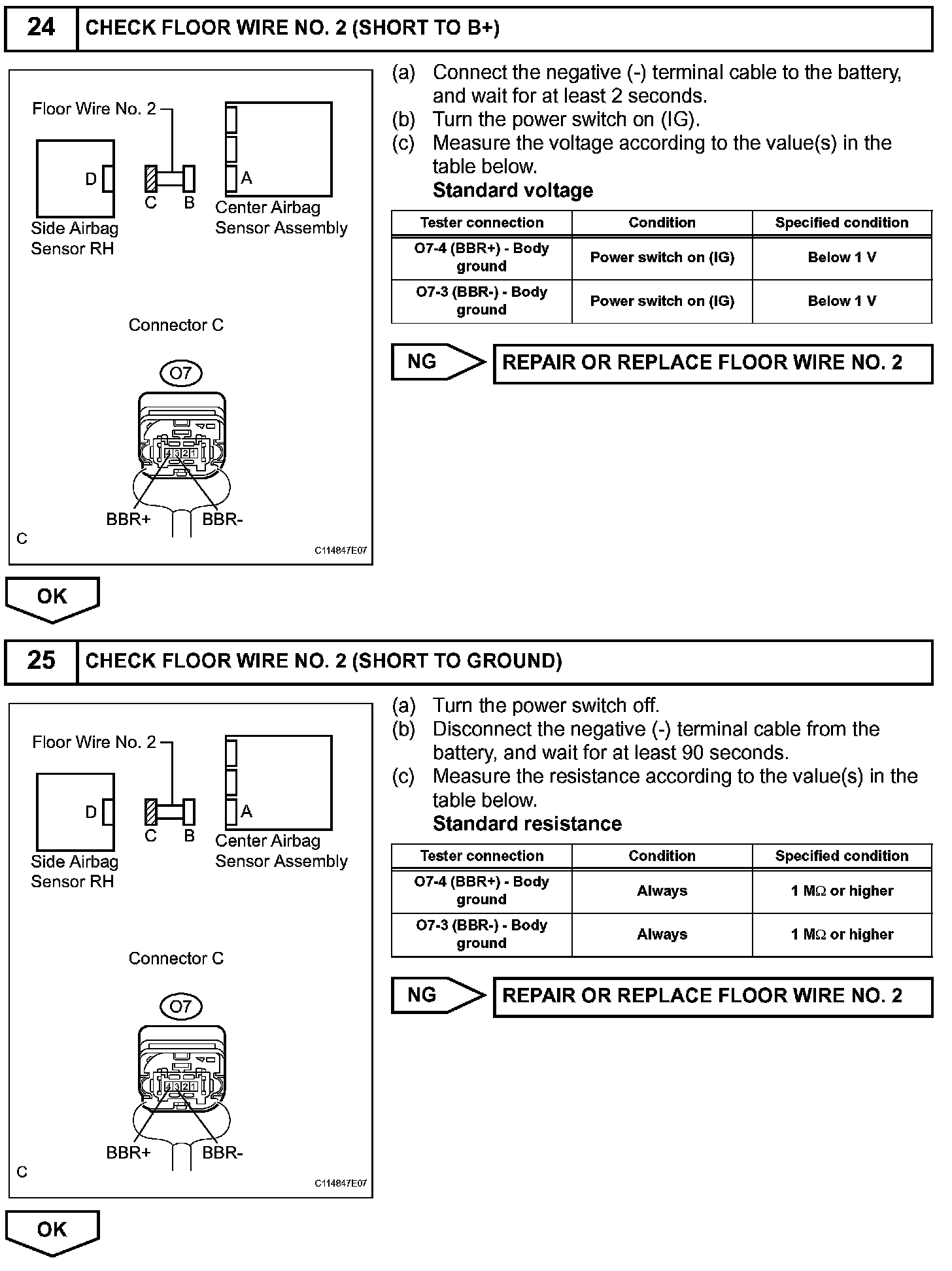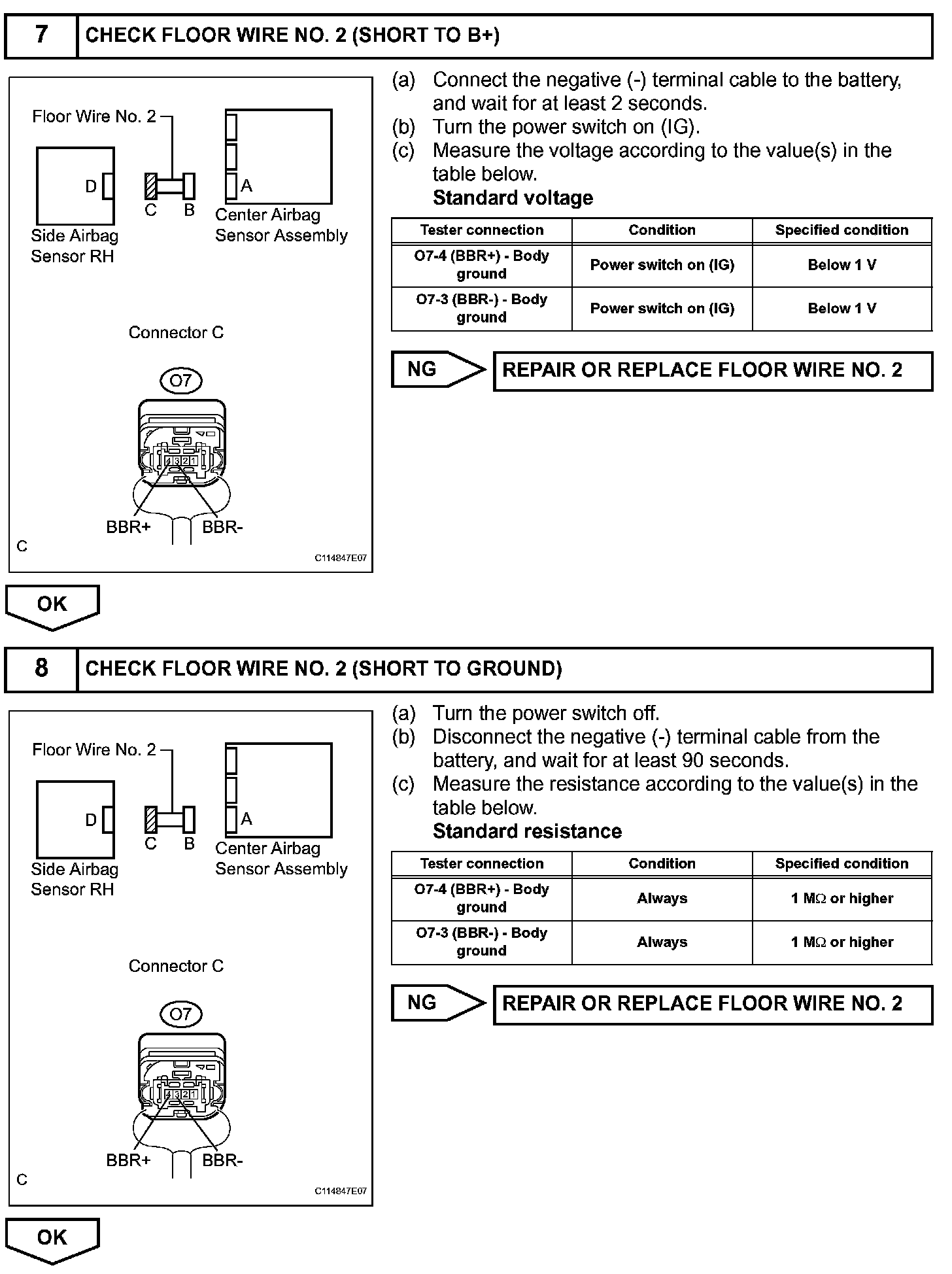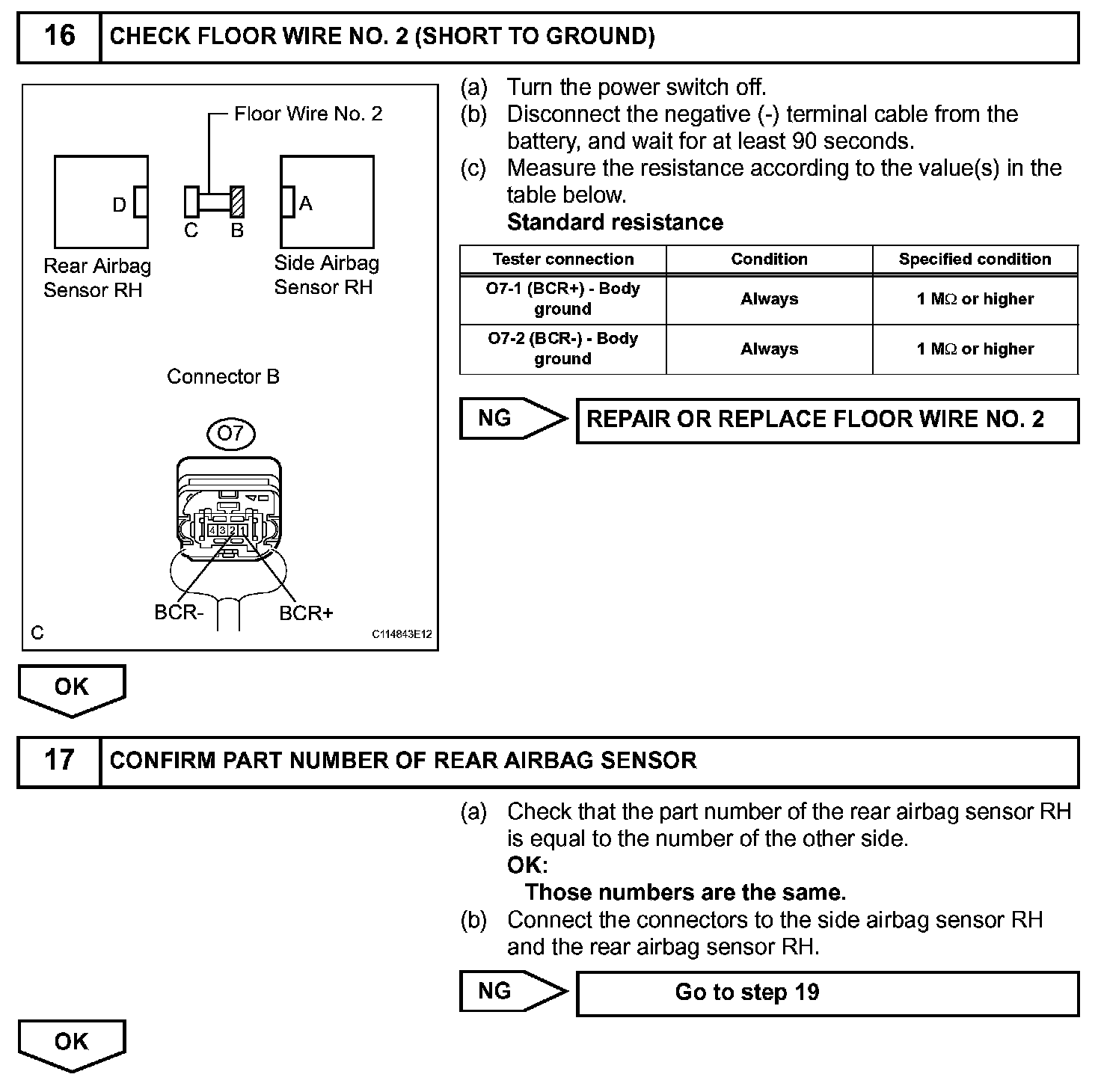 The circuit for the side collision sensor RH (to determine deployment of the front seat side airbag assembly RH and curtain shield airbag assembly RH) is composed of the center airbag sensor assembly, side airbag sensor RH, and rear airbag sensor RH.