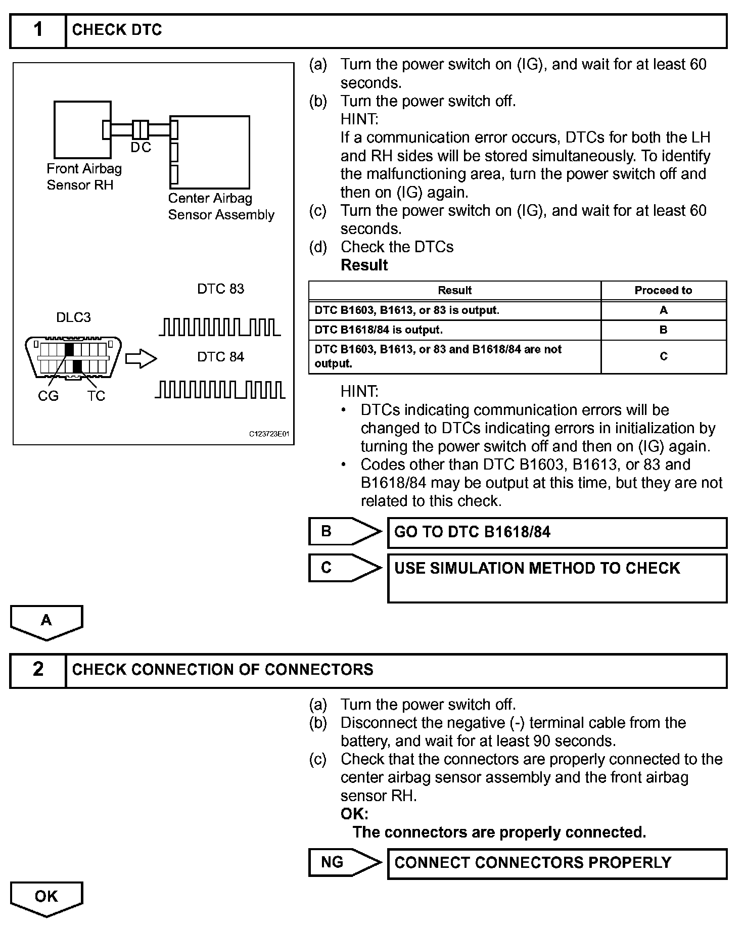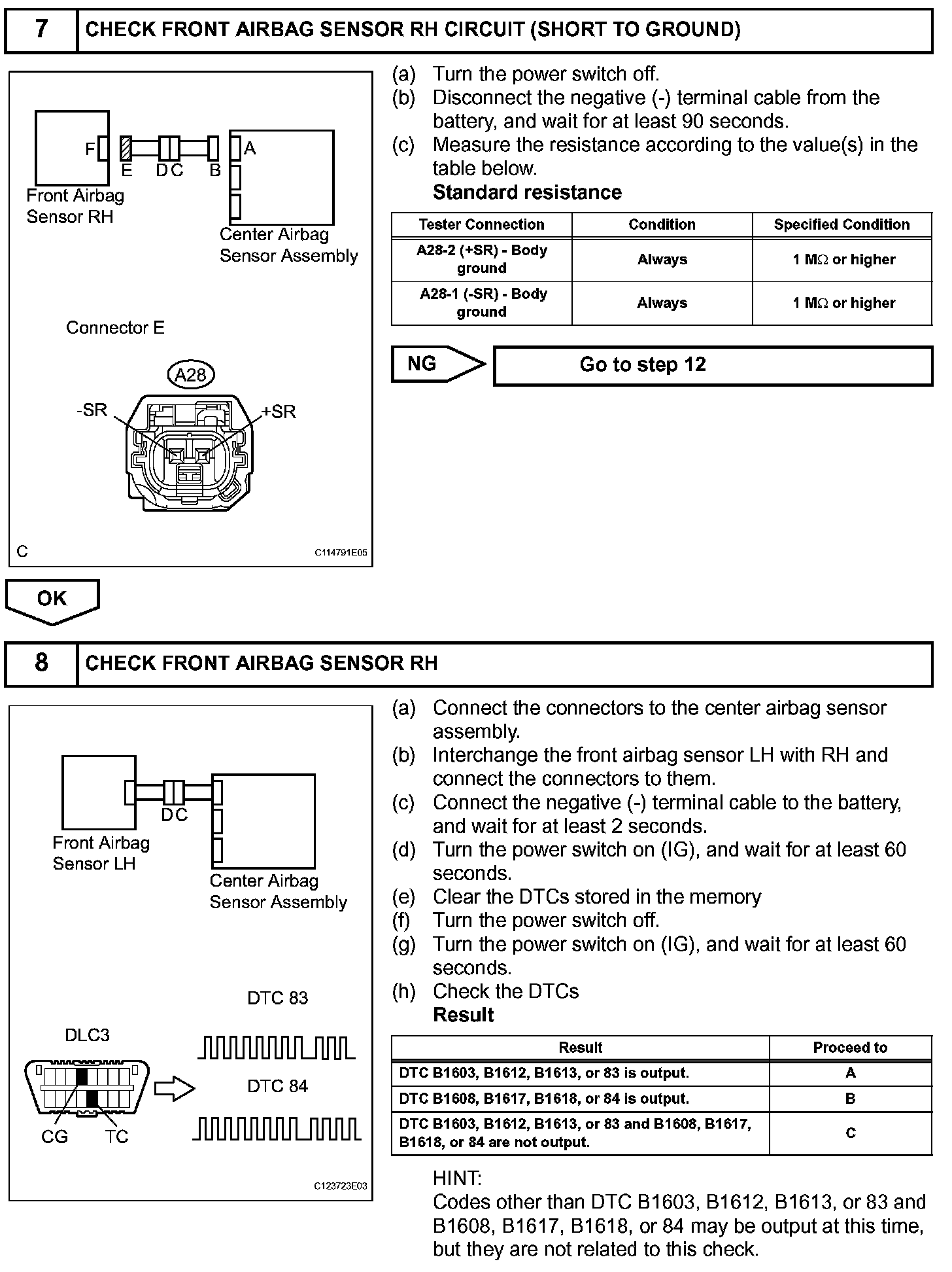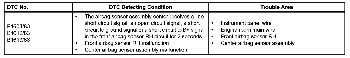DTC B1603/83, B1612/83, or B1613/83 is recorded when a malfunction is detected in the front airbag sensor RH circuit.