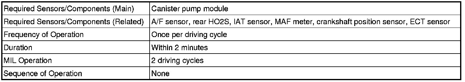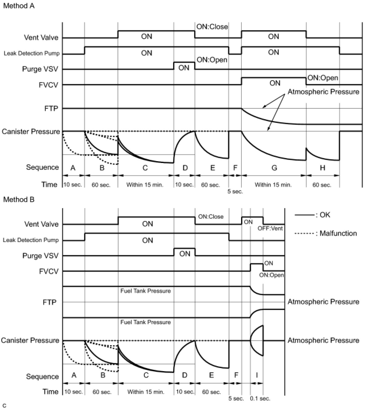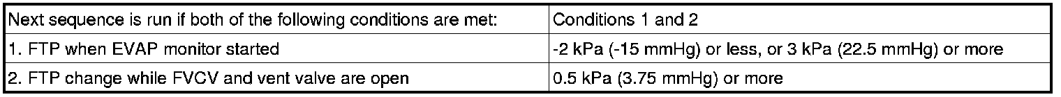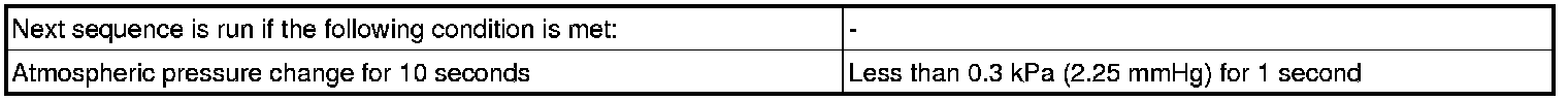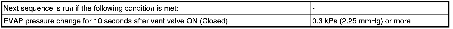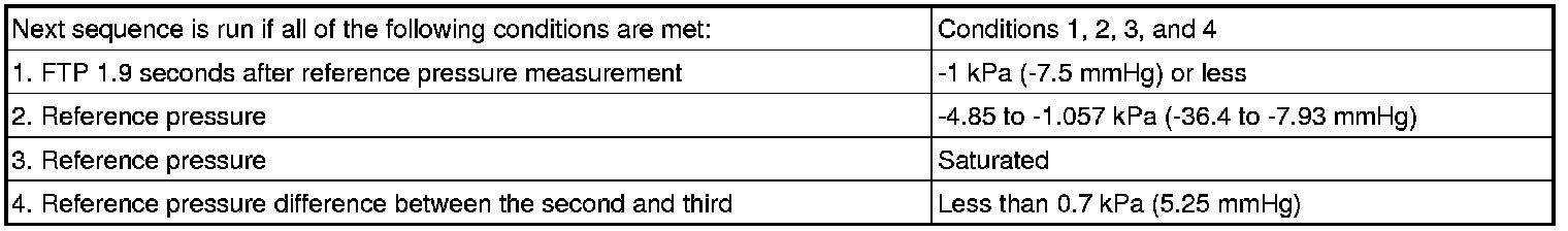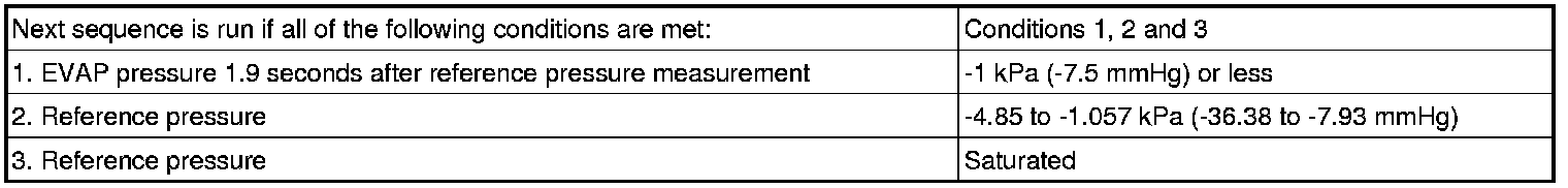 In sequence B and E, the leak detection pump creates negative pressure (vacuum) through the reference orifice. The EVAP system pressure is then measured by the ECM, using the canister pressure sensor, to determine the reference pressure. If the pressure is one of the following conditions, the ECM illuminates the MIL and sets the DTC (2-trip detection logic).