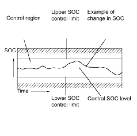 The battery smart unit and hybrid vehicle control ECU calculate the SOC (state of charge) of the HV battery based on the accumulated amperage in the HV battery. The battery smart unit sends a signal indicating the condition of the HV battery to the hybrid vehicle control ECU. The hybrid vehicle control ECU then calculates the SOC based on this information and controls HV battery charge and discharge according to the driving conditions.