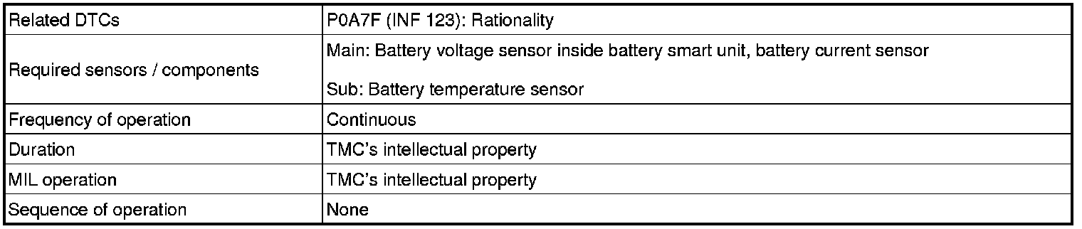 The battery smart unit calculates the resistance of the HV battery using amperage and voltage, and uses this resistance to determine the extent of deterioration of the HV battery. If the battery smart unit detects that the resistance of the HV battery has exceeded the standard, it determines that a malfunction has occurred. In addition, the battery smart unit monitors the SOC, and if the difference between the maximum and minimum SOC values exceeds the standard, it determines that a malfunction has occurred. When either of the DTC detection conditions is met, the HV control ECU will illuminate the MIL and set a DTC.