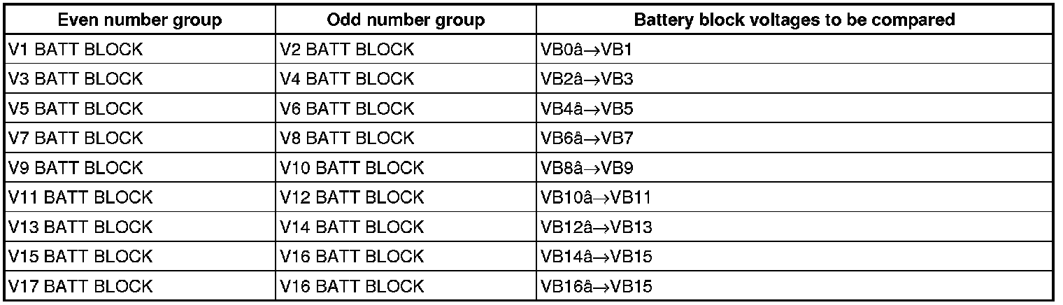 (i) Compare the battery block voltages (V1 to V17 BATT BLOCK) between the even and odd number groups in each combination shown in the table below.