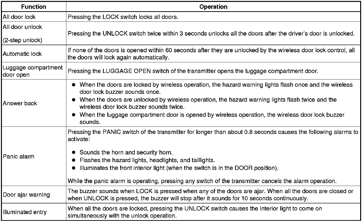 The door control transmitter has the LOCK, UNLOCK, LUGGAGE OPEN, and PANIC switches. Operating these switches activates each function.