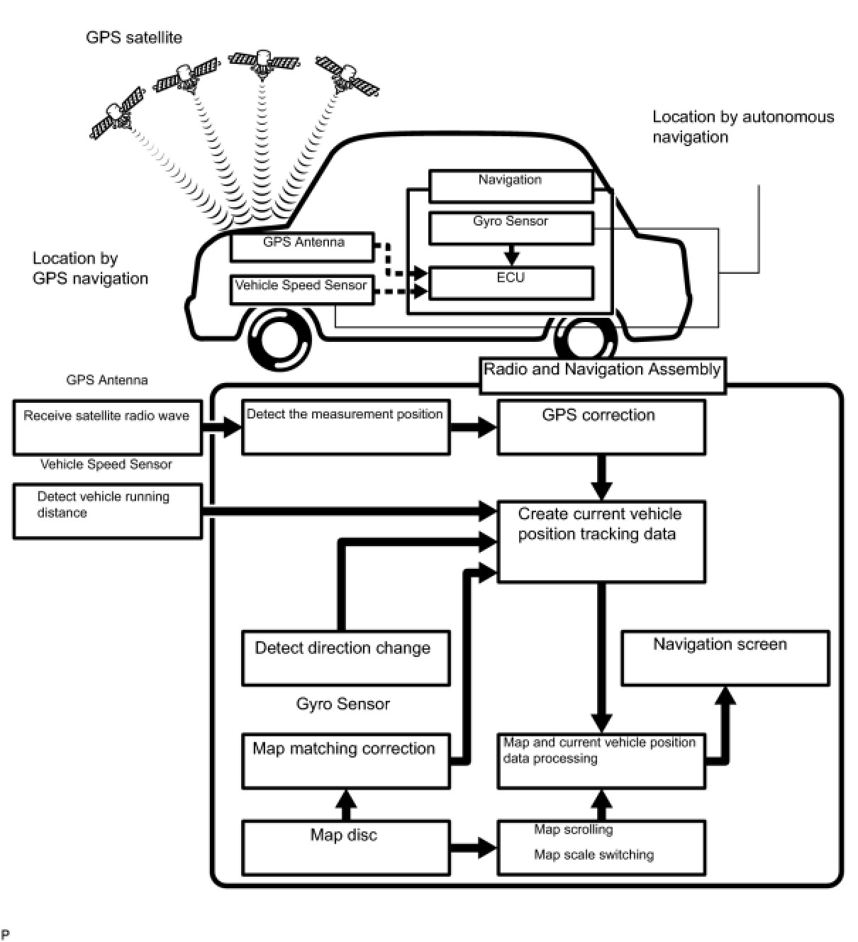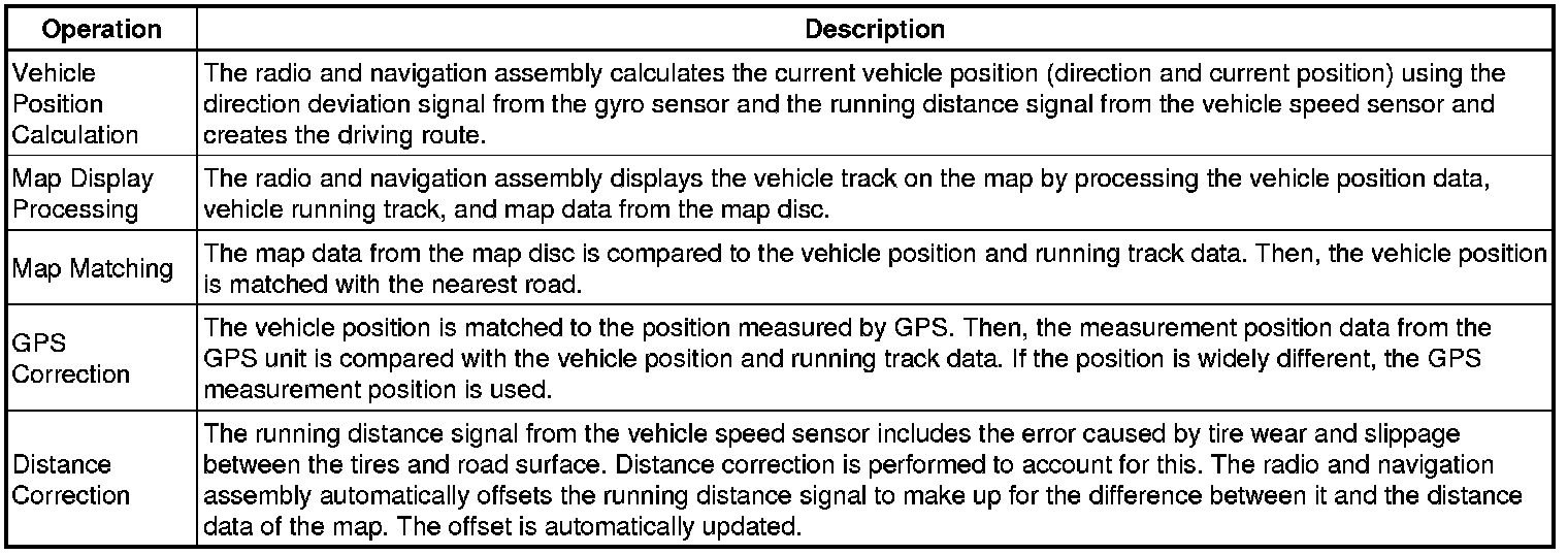 The current driving route is calculated by autonomous navigation (according to the gyro sensor and vehicle speed sensor) and GPS navigation. This information is then compared with possible road shapes from the map data in the map disc and the vehicle position is set onto the most appropriate road.