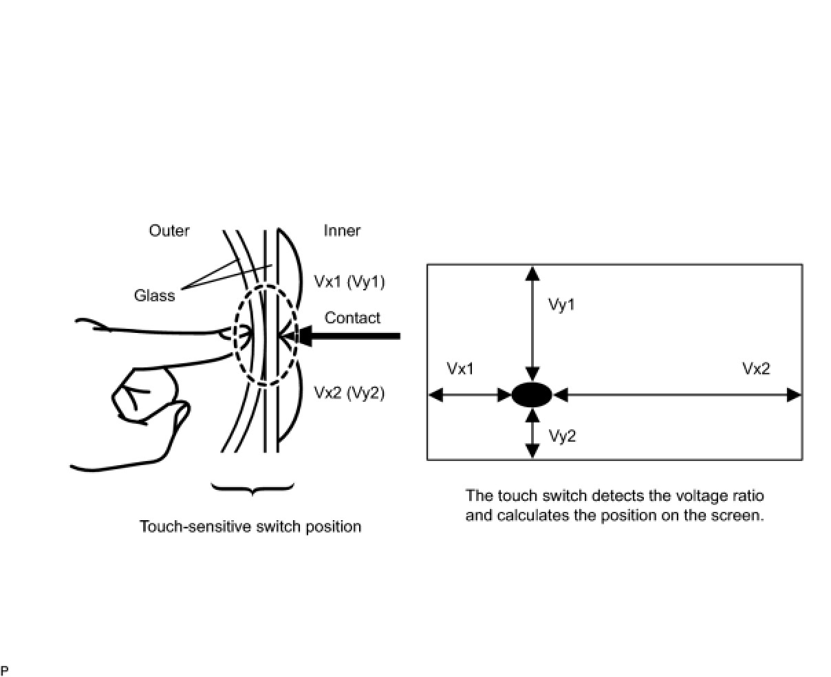 Touch switches are touch-sensitive (interactive) switches operated by touching the screen. When a switch is pressed, the outer glass bends in to contact the inner glass at the pressed position. By doing this, the voltage ratio is measured and the pressed position is detected.