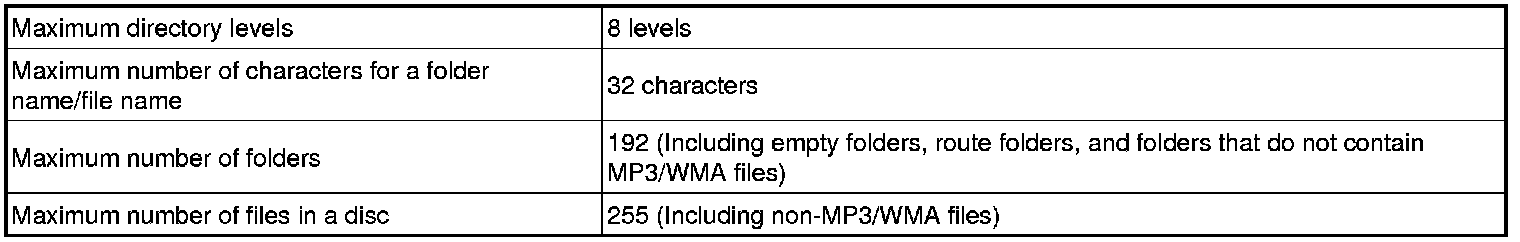 - As for MP3/WMA files written in any format other than those above, the contents of the files may not be played normally or the file names or folder names may not be displayed correctly.