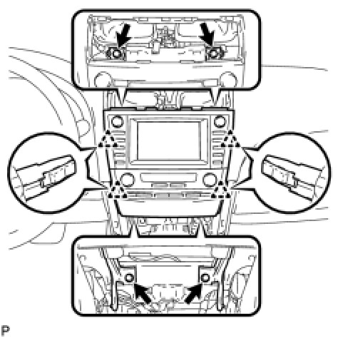 (b) Pull the navigation receiver with heater control panel assembly toward the rear of the vehicle and disengage the 4 clips.