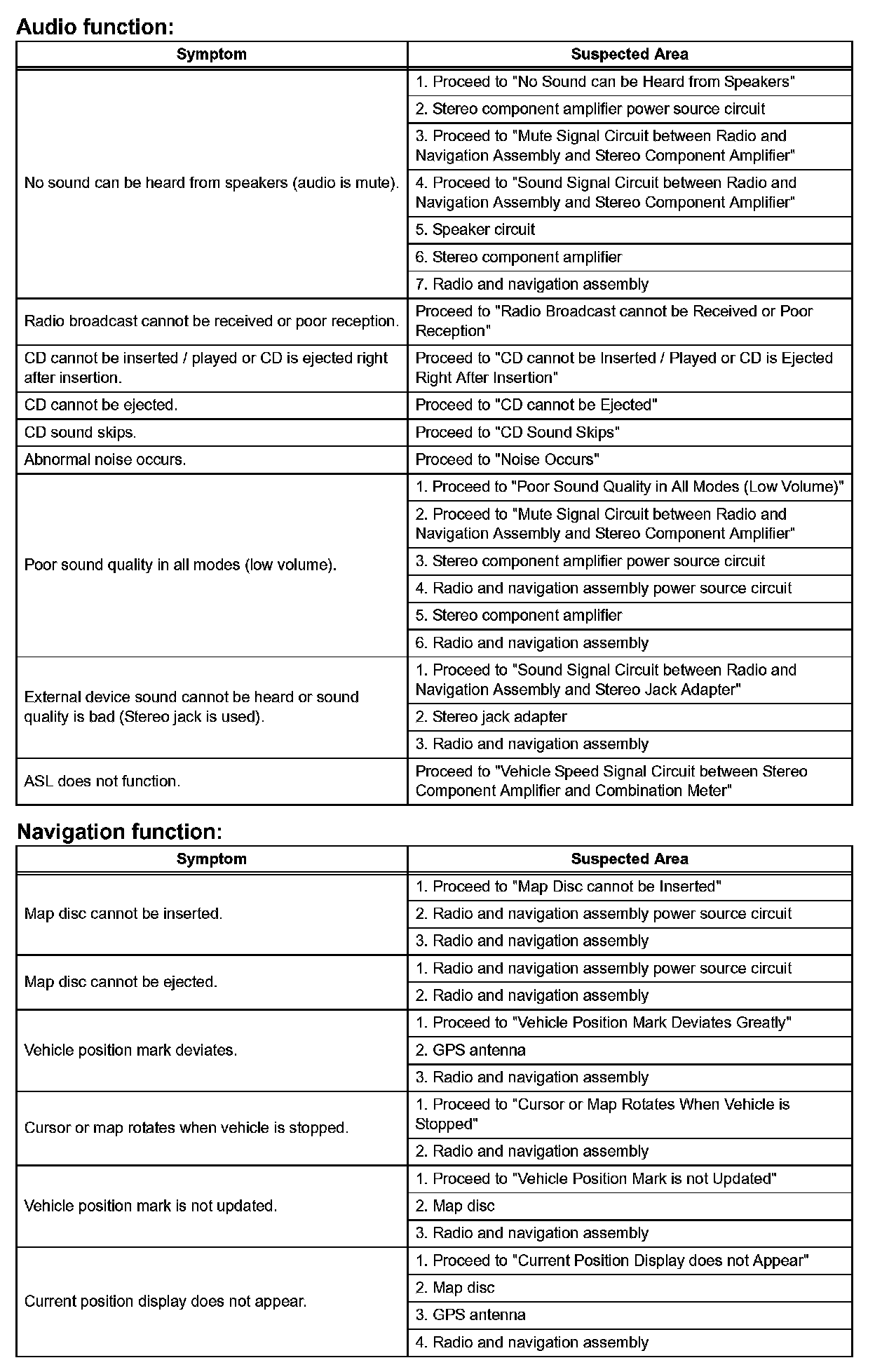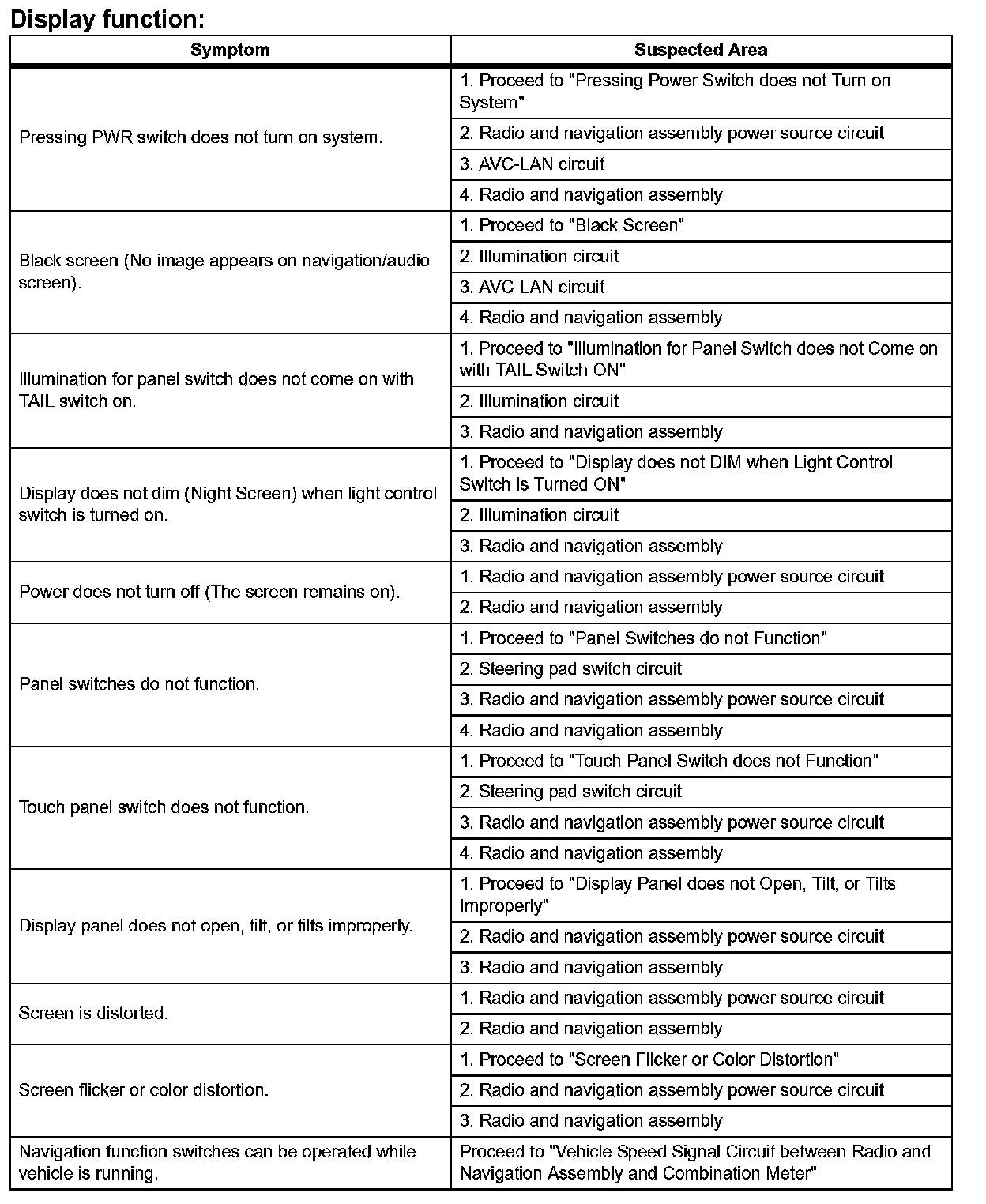 - Before inspecting the suspected areas listed in the table, check the fuse and relay.