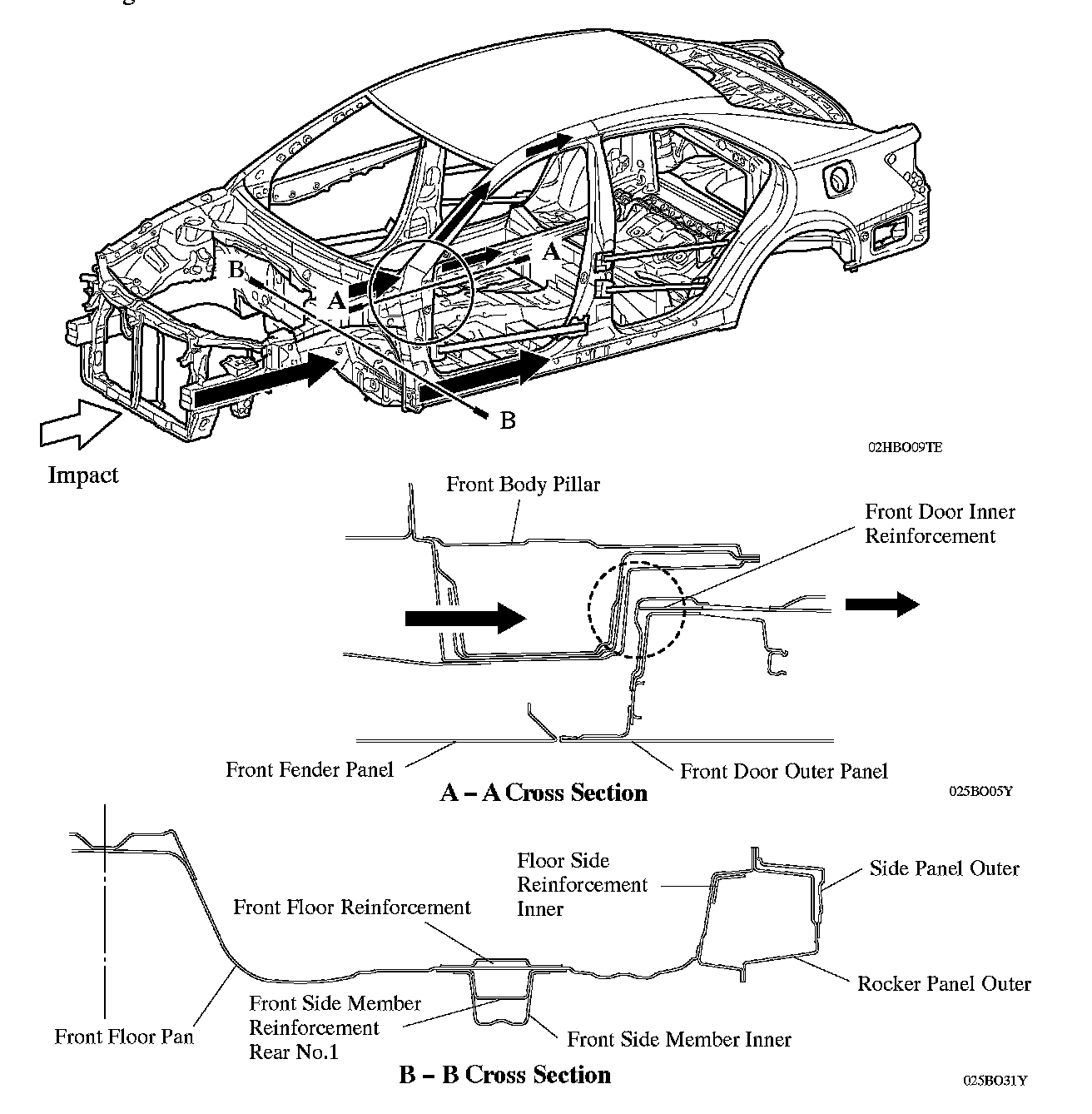 ^ The body strengthens inner door reinforcements and reduces the gap between the door inner panel and the pillar. This communicates impact load to the door belt line reinforcement, reducing the load on the pillar in the event of an offset frontal collision.