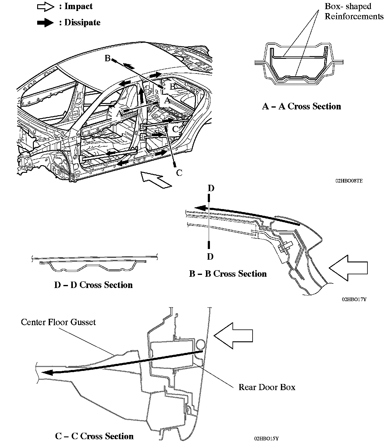 ^ A box is used for the rear door inner and a gusset is used for the center floor cross member on the cabin interior side. When a side collision occurs, loads are conducted from the box to the gusset, deformation of the vehicle body is minimized (C - C cross section).