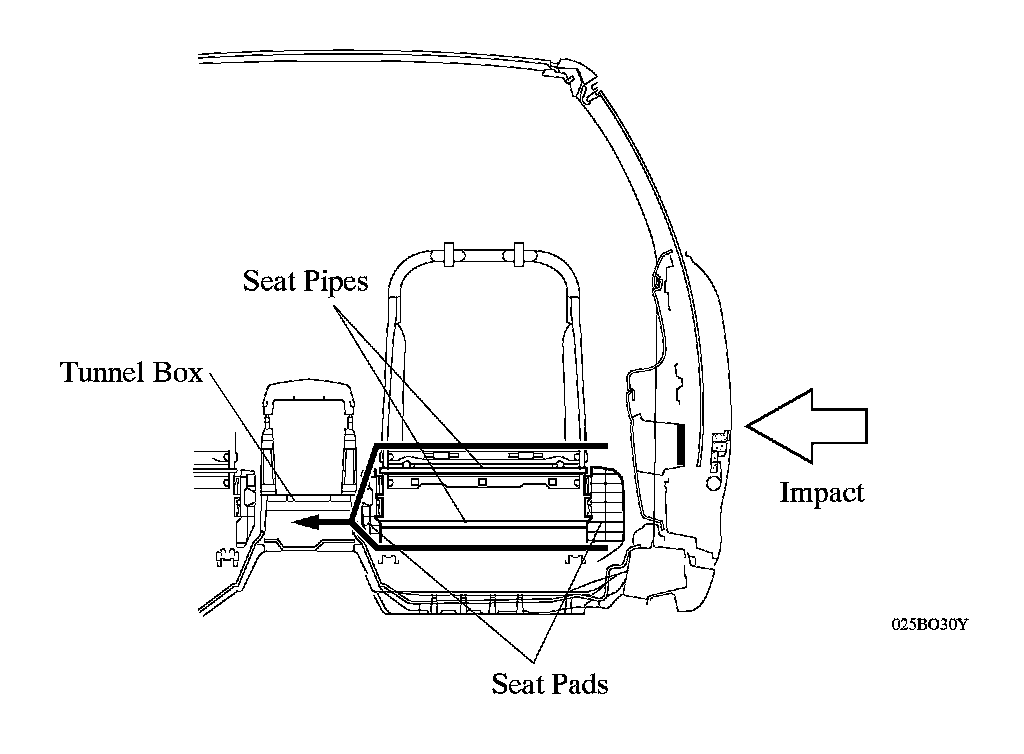 ^ Seat pipes and seat pads have been provided on the front seat pillar frame for load conduction. Furthermore, the tunnel box has been reinforced. Thus, input load is conducted from the pillar and door to the seat, tunnel box and opposite seat, minimizing deformation of the body.