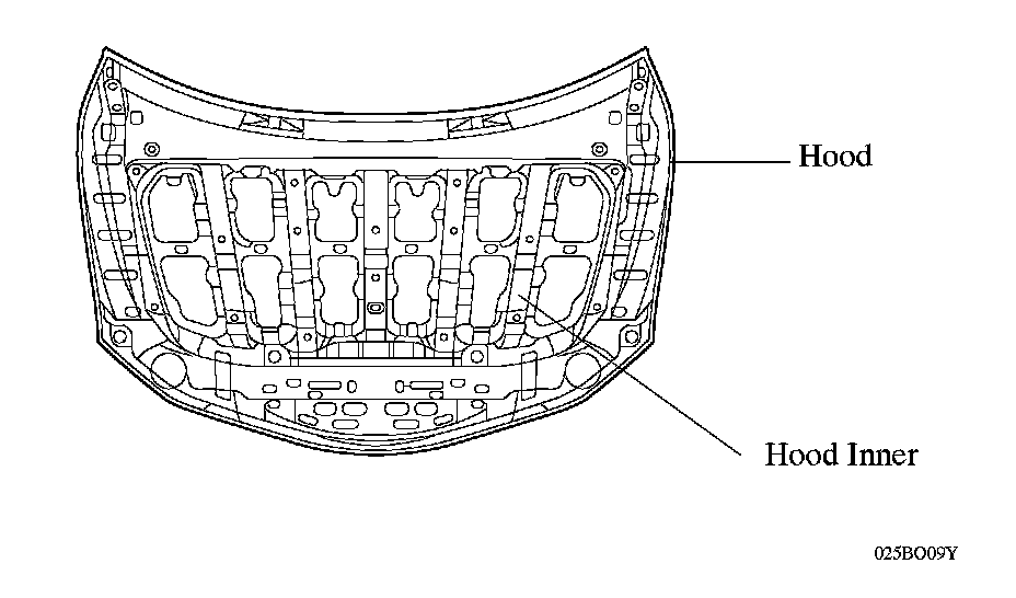 ^ A longitudinal frame is used as the principle structure of the hood inner; giving uniform rigidity to the hood surface.