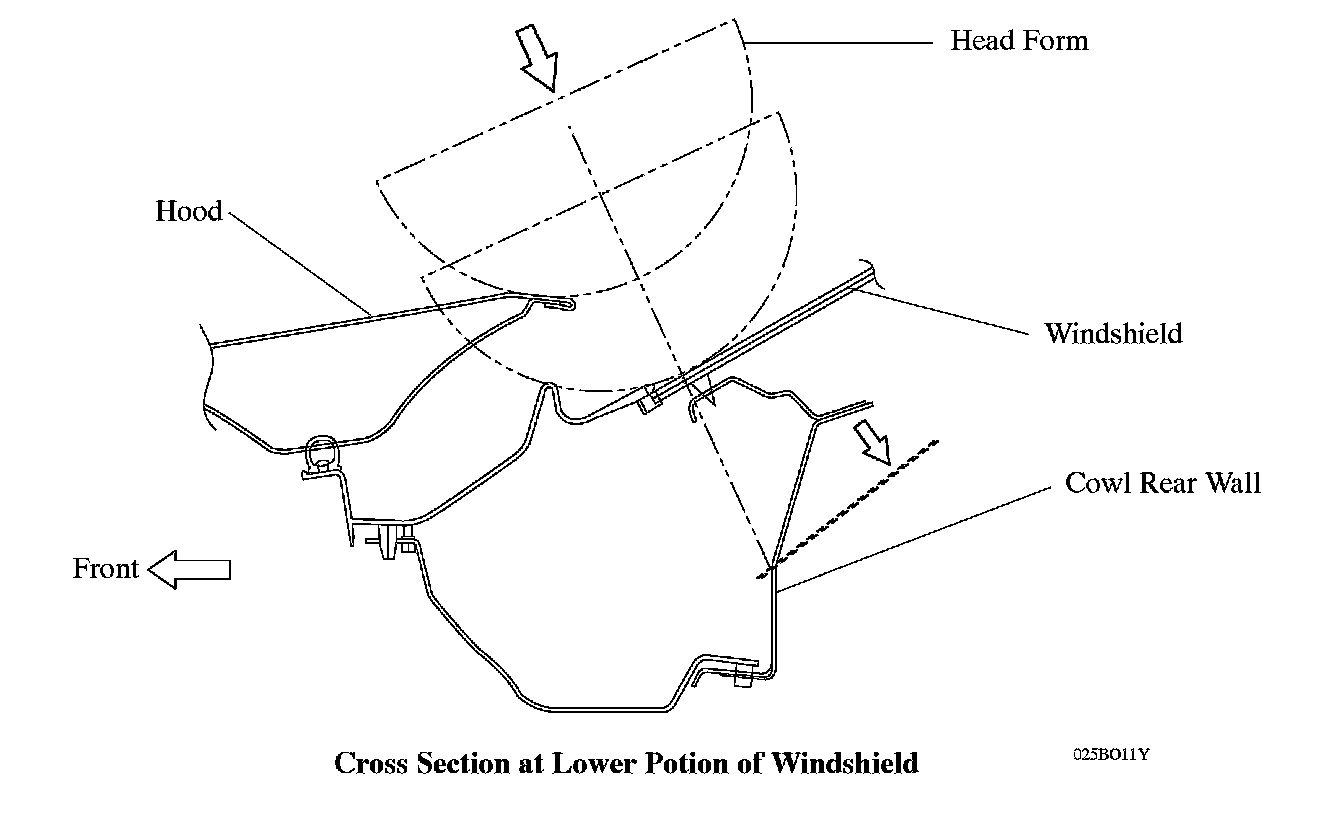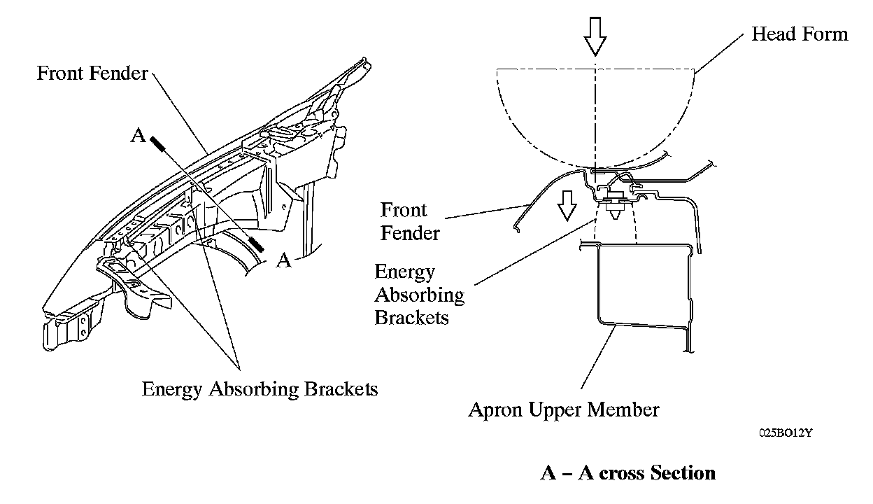 ^ Energy absorbing brackets are used in the joint portion of the front fender. Thus, a certain deformation stroke in the event of a head form collision has been ensured, reducing the impact.