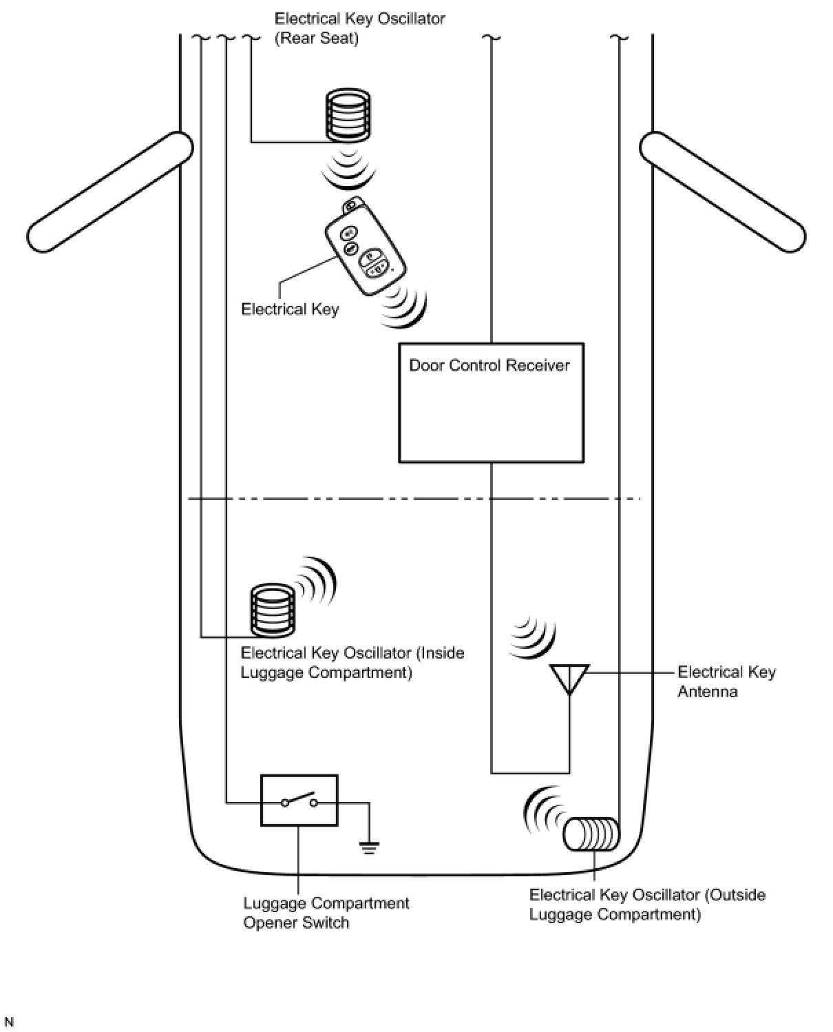 - The detection area of front door oscillator is formed by transmitting a request signal every 0.25 seconds while the power switch is off and each door is locked. In this way, it detects the proximity of an electrical key. During entry lock, the detection area is formed with the lock switch on.