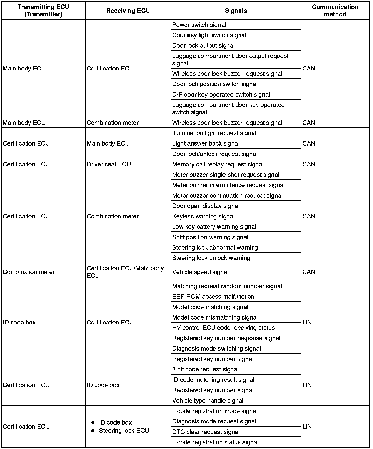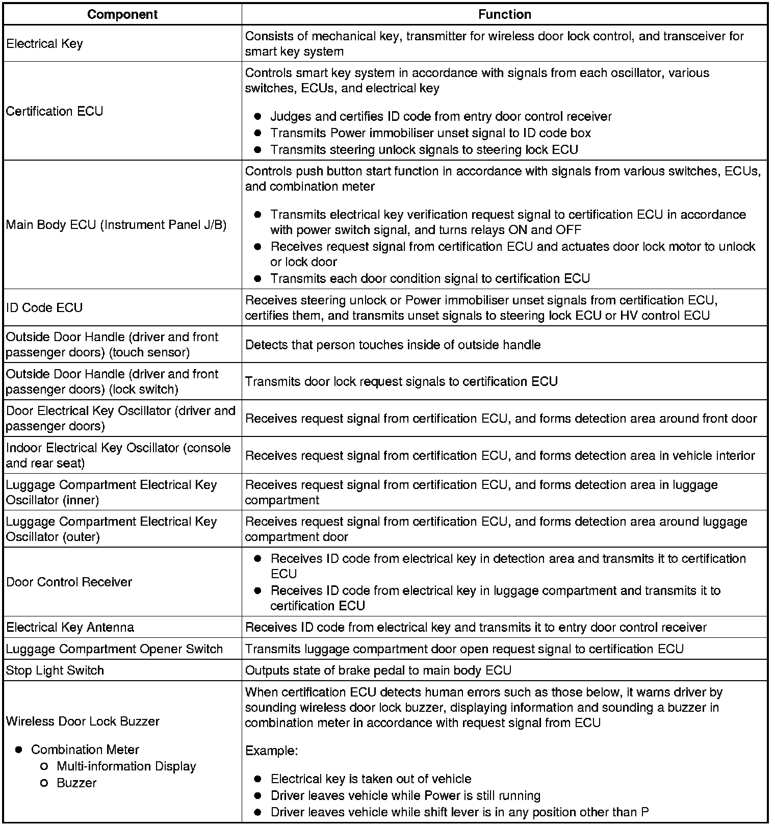 - This system is controlled by the certification ECU. When the certification ECU detects the presence of an electrical key in one of the detection areas, it identifies and checks the ID code, and outputs operation signals to the related ECU in accordance with their functions.