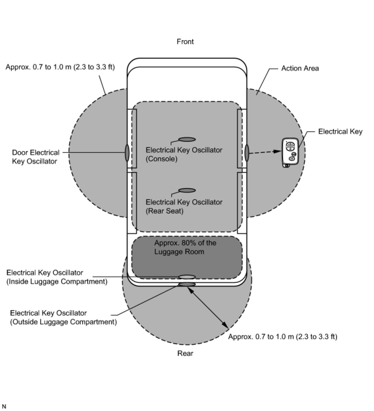Each oscillator transmits the request signal received from the certification ECU, and forms an electrical key detection area to detect the presence of an electrical key. The detection area formed by front door oscillator and luggage compartment outer oscillator is approximately 0.7 to 1.0 m (2.3 to 3.3 ft) from the outside handle of front door or the center of the rear bumper.