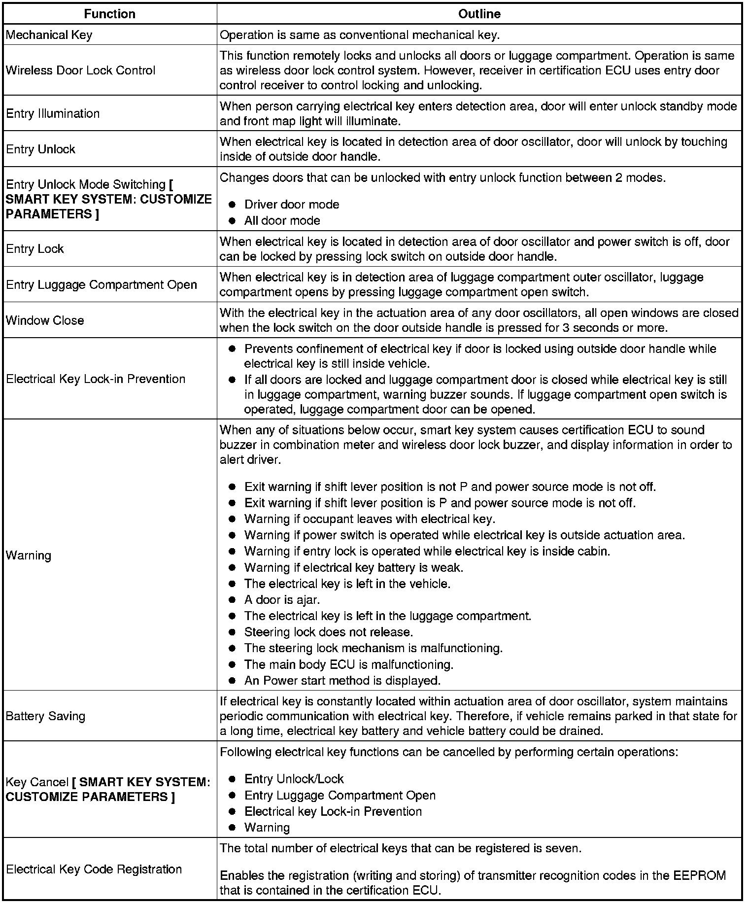 (a) In addition to conventional mechanical key and wireless door lock control functions, the smart key system enables door locking/unlocking, steering lock releasing, and luggage compartment door opening without operating the electrical key. The only requirement is that the electrical key is in the user's possession.