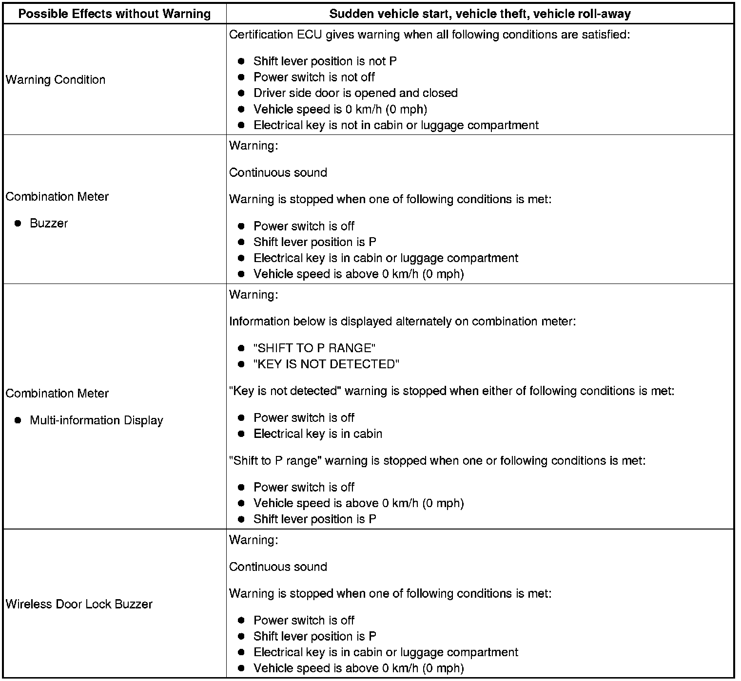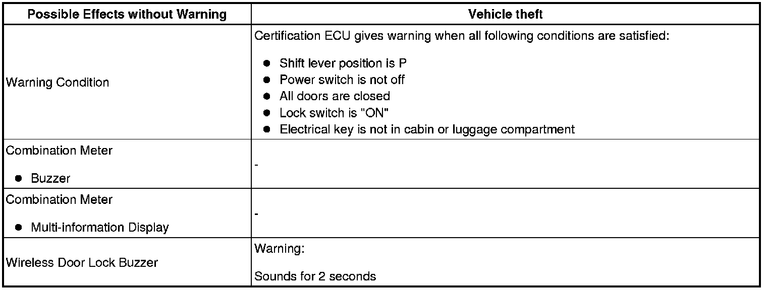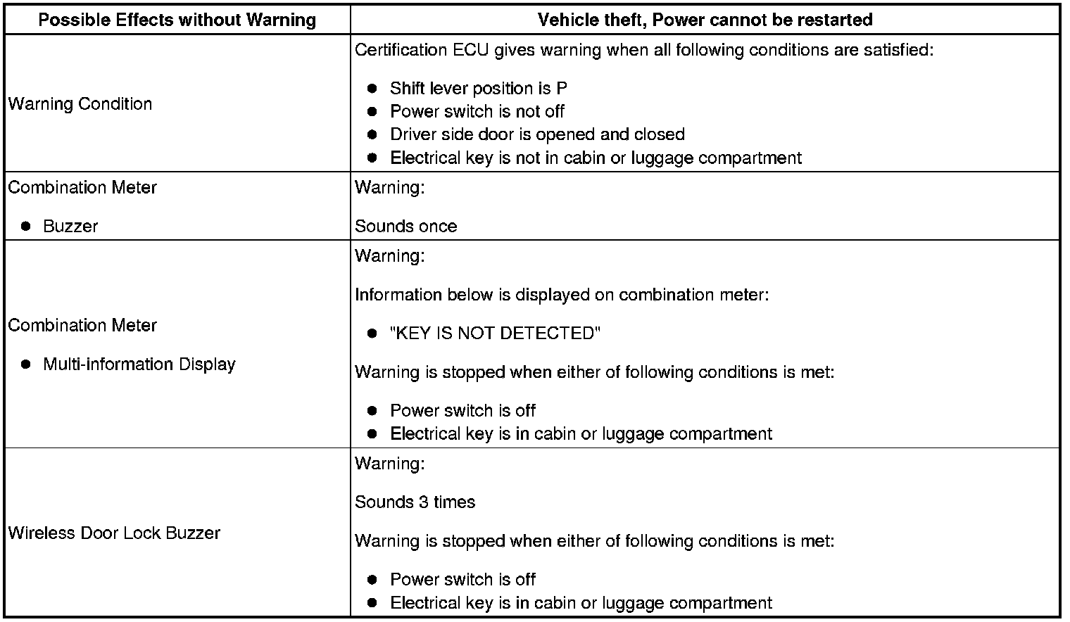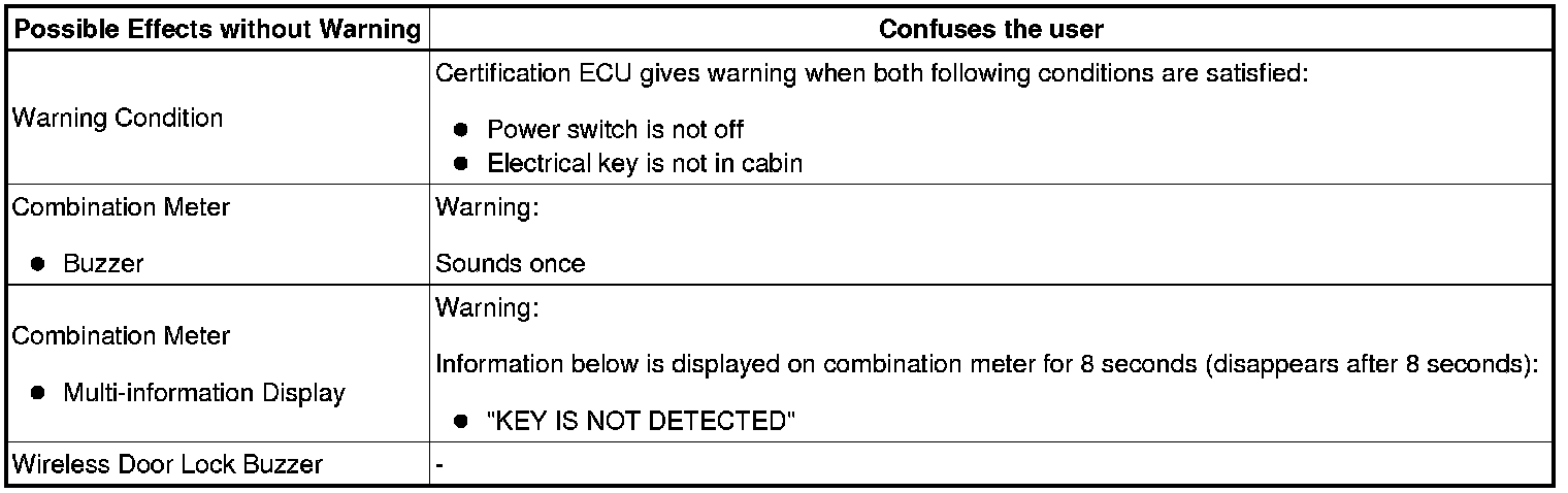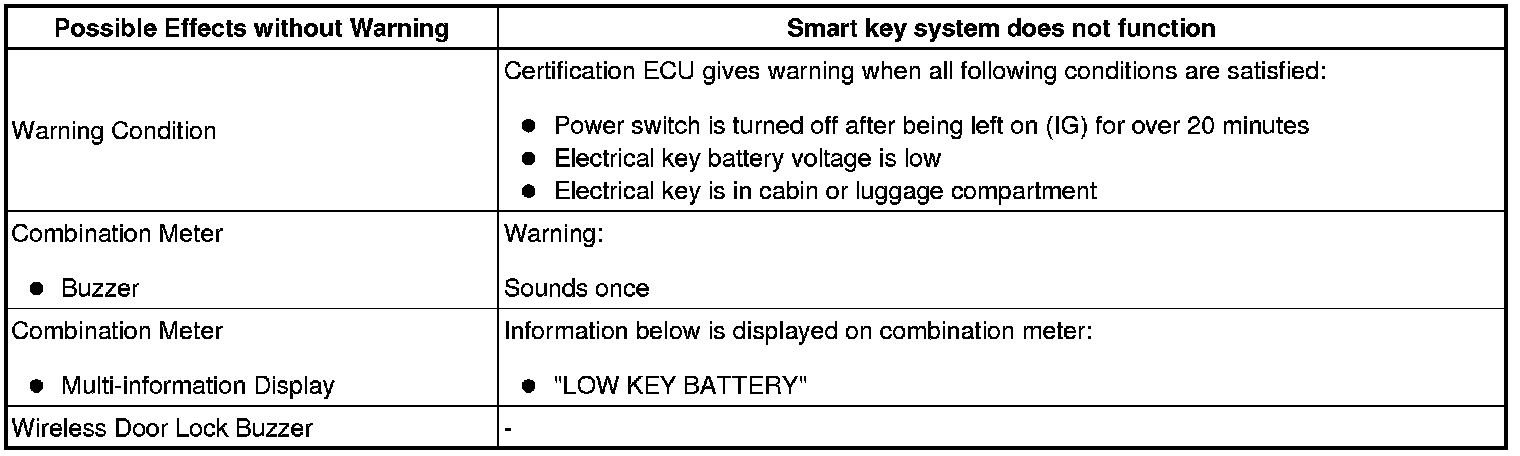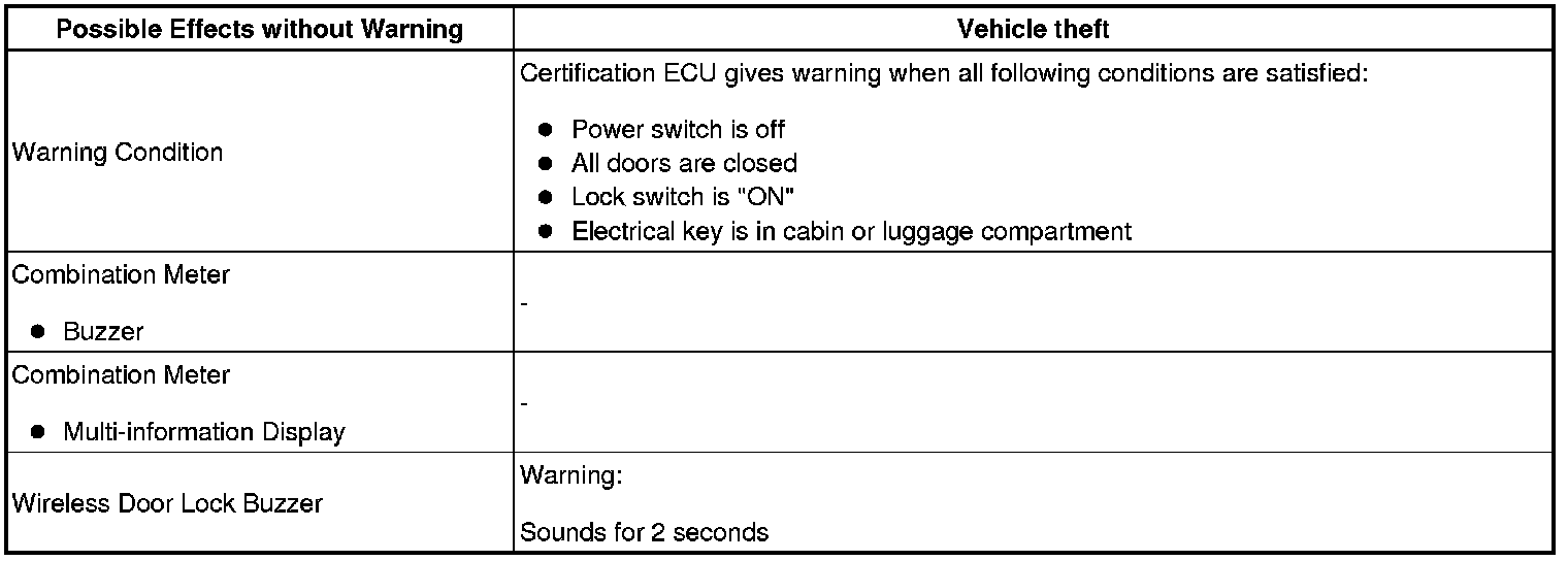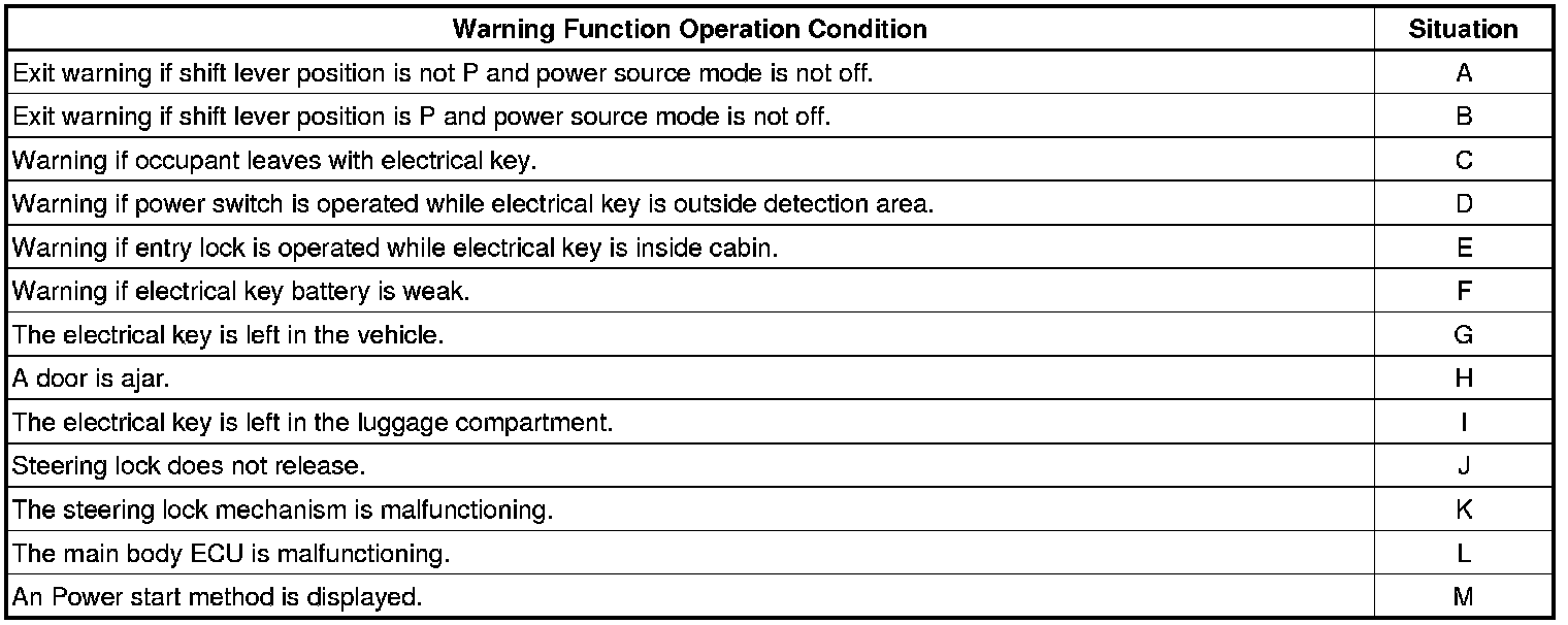 When any of the situations below occur, the smart key system causes the certification ECU to sound the buzzer in the combination meter and the wireless door lock buzzer, and illuminate the combination meter's multi-information display in order to alert the driver.