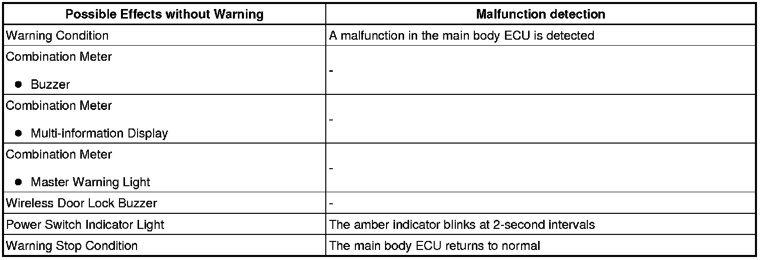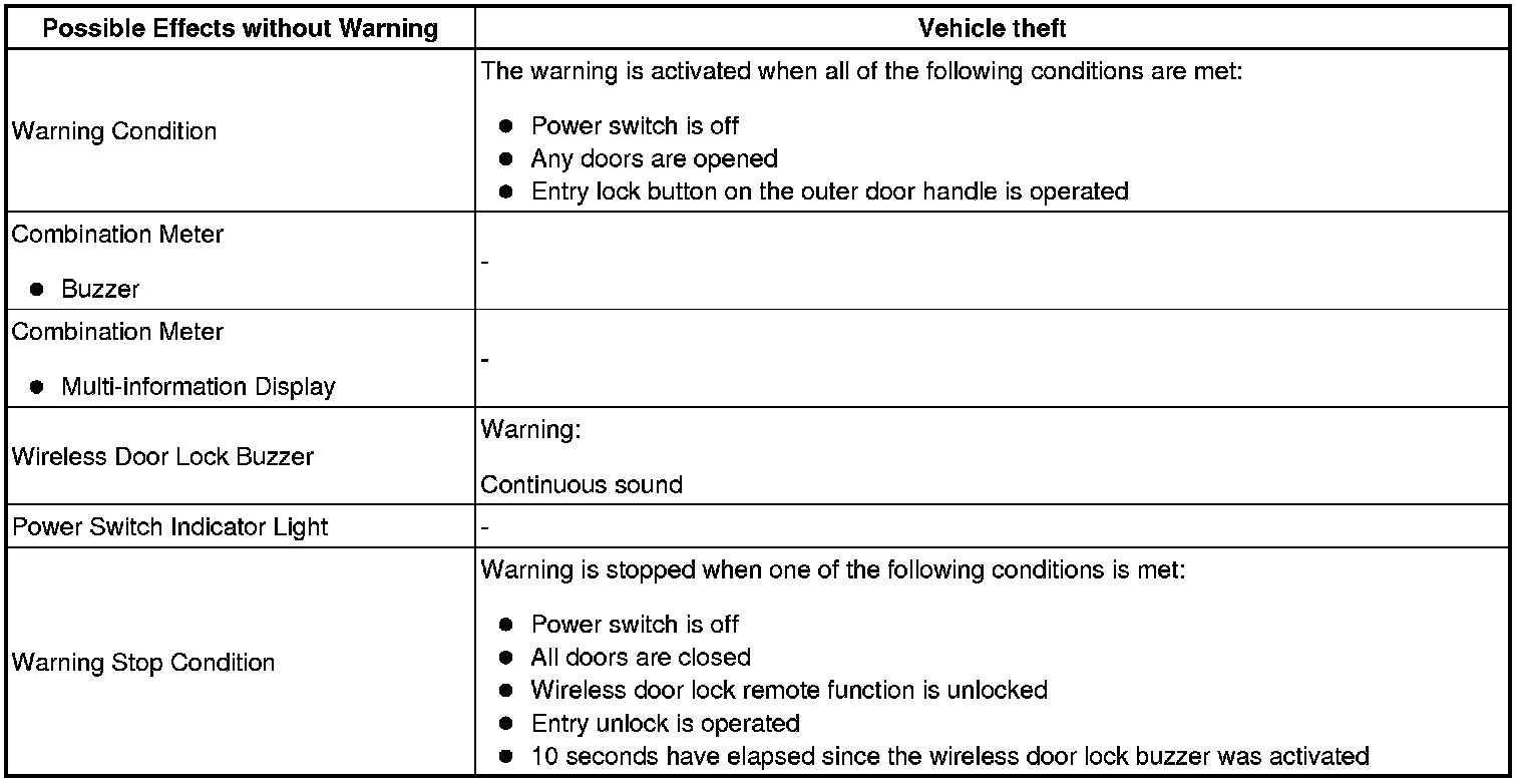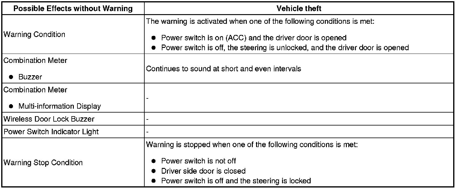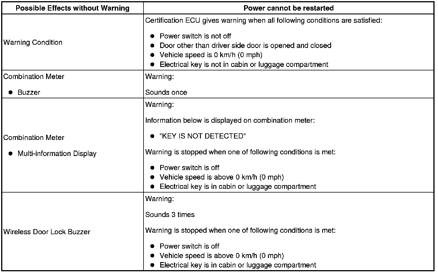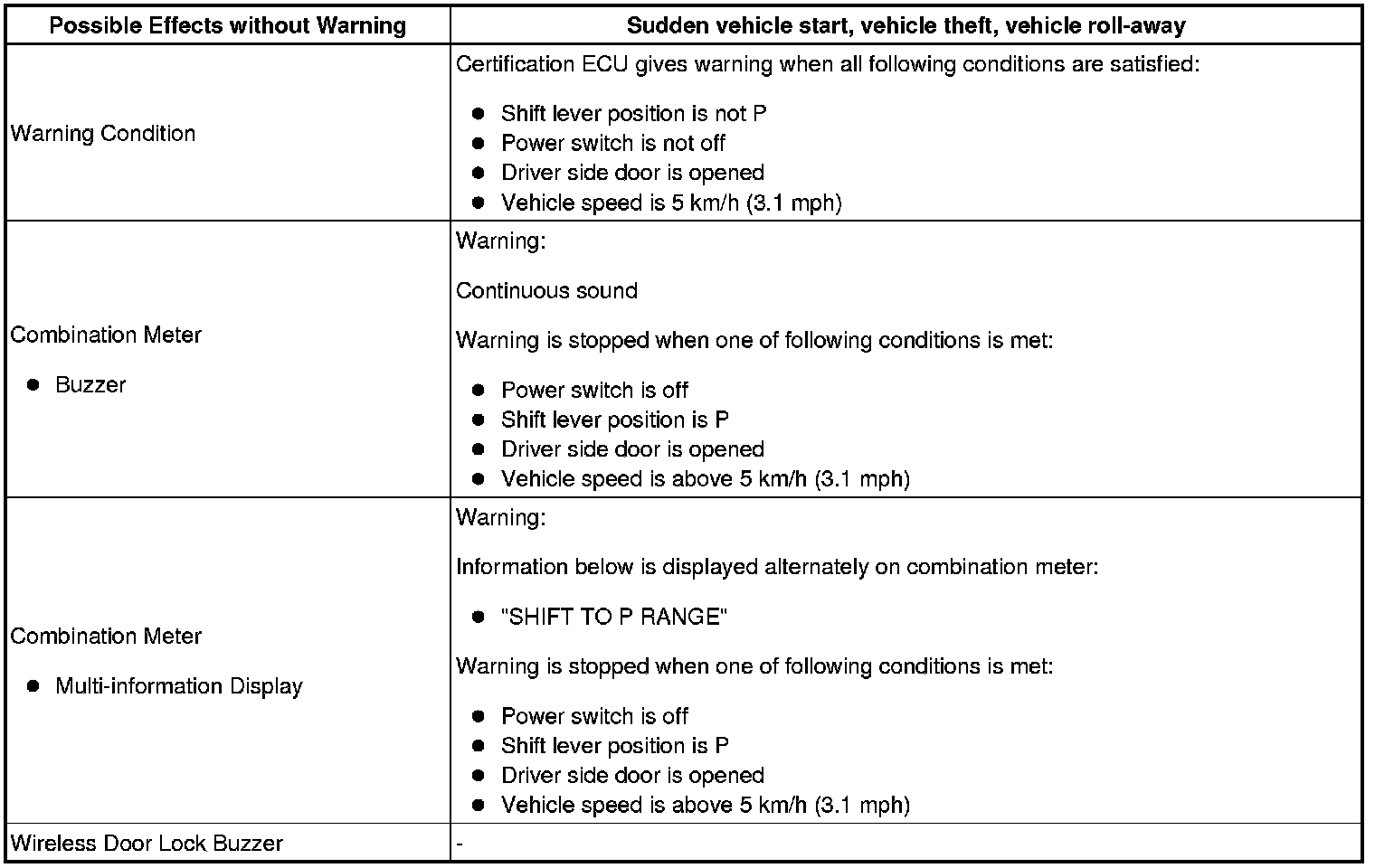 When any of the situations below occur, the smart key system causes the certification ECU to sound the buzzer in the combination meter and the wireless door lock buzzer, and illuminate the combination meter's multi-information display in order to alert the driver.