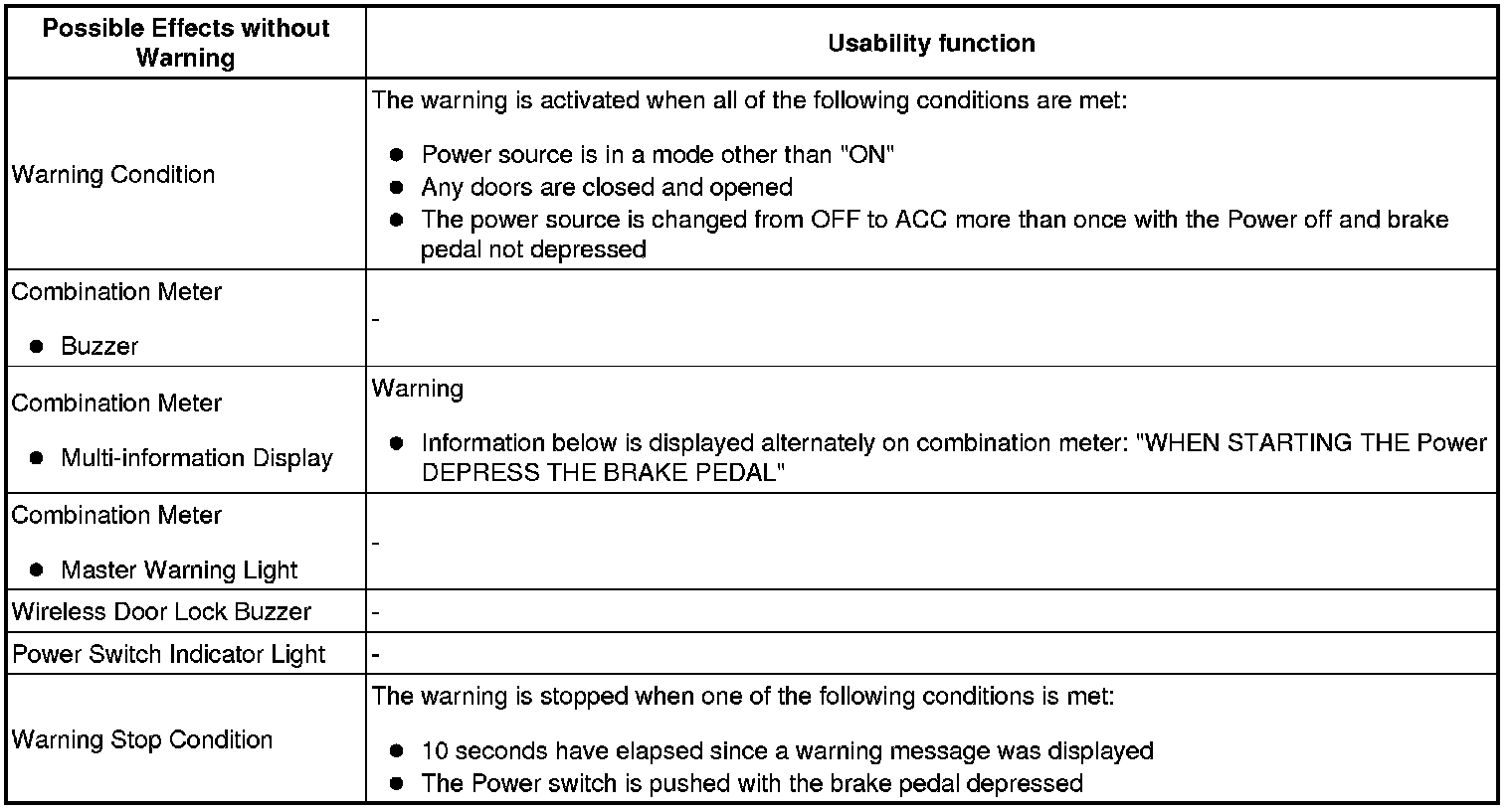A warning message appears on the meter when the driver does not follow the proper procedure to start the vehicle.