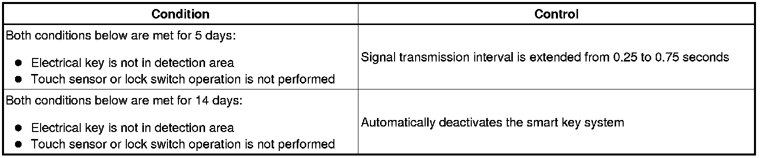 In the smart key system, signals are emitted outside of the vehicle at a prescribed interval (0.25 seconds) when the doors are locked. Therefore, the vehicle battery could be drained if the vehicle remains parked for a long time. For this reason, the controls listed below are carried out: