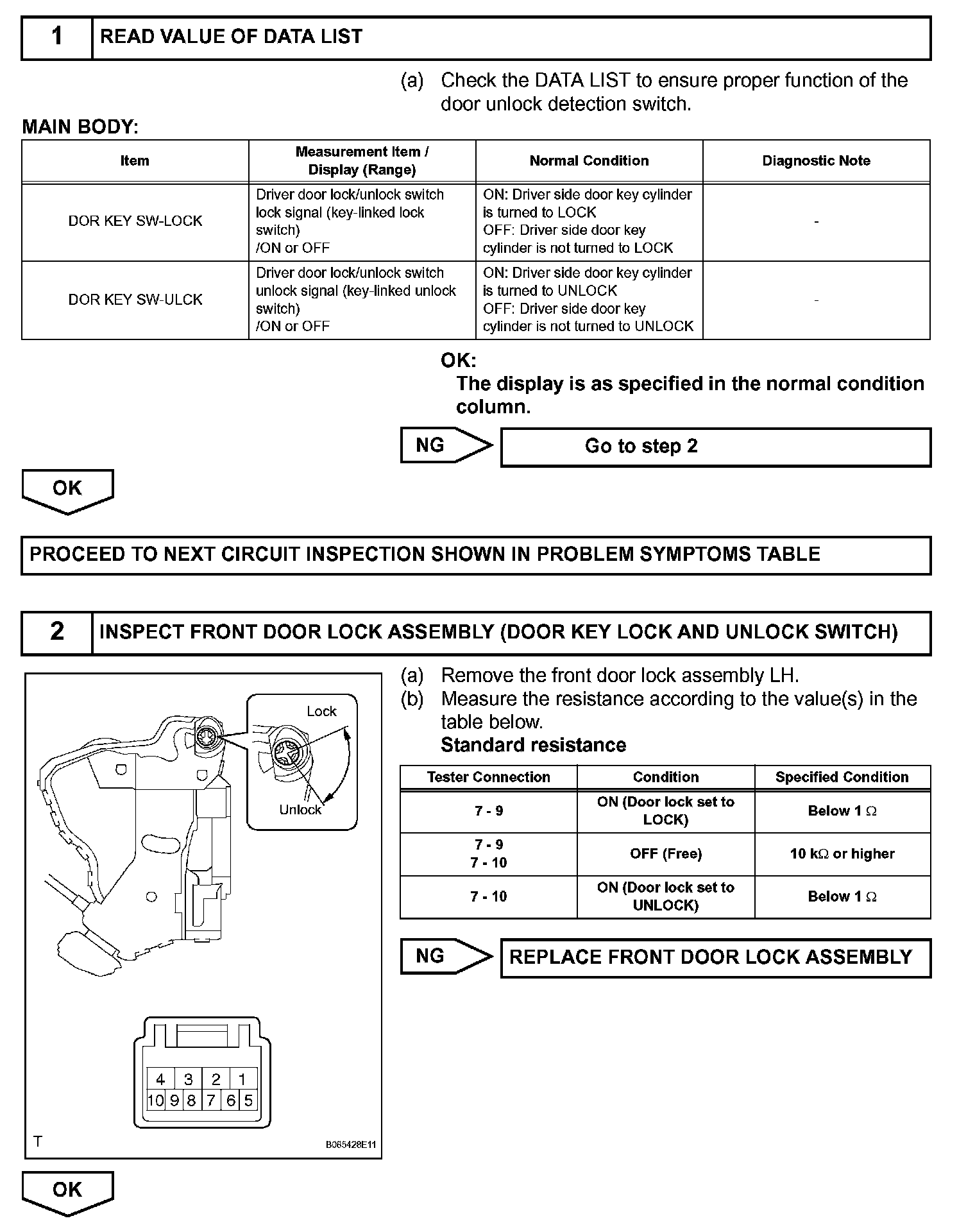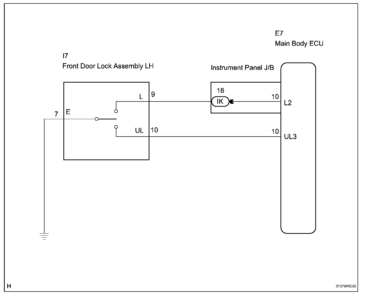 When the driver's door key cylinder is turned to lock all the doors by key, there is continuity between terminals L and E of the key lock and unlock switch. When the cylinder is turned to unlock the door(s), there is continuity between terminals UL and E.