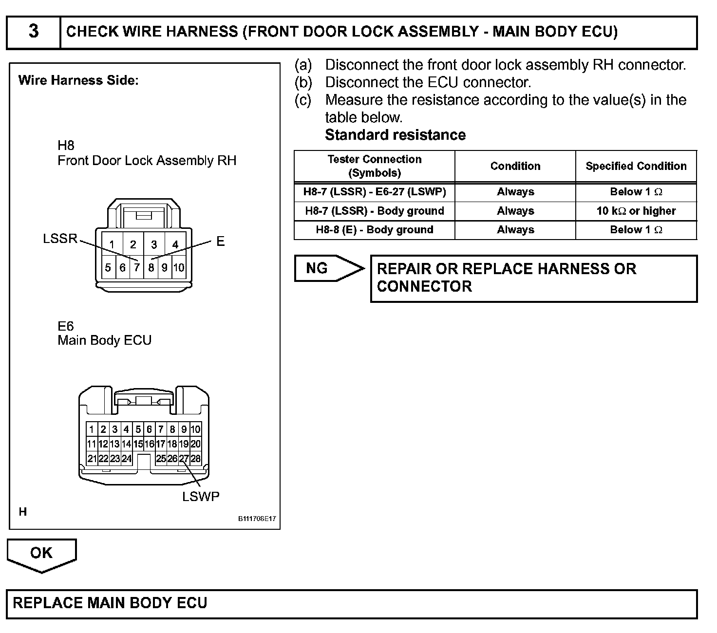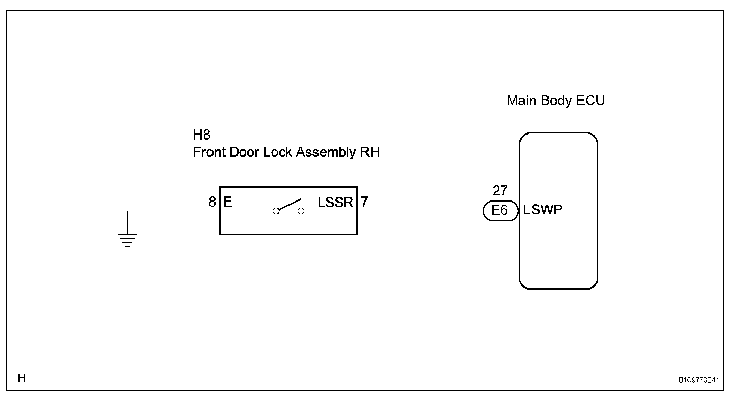 The main body ECU is connected to the front passenger door lock assembly via terminal LSWP and front passenger door lock/unlock state signals are input to the ECU.