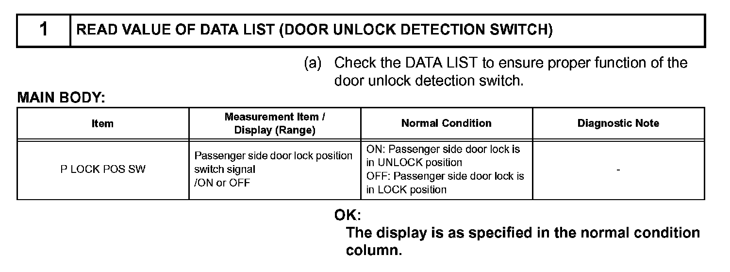 The main body ECU applies voltage to the door unlock detection switch via terminal LSWP. When the door unlock detection switch is on (there is continuity between the switch terminals), a lock state signal is input to the ECU. When the switch is off (there is no continuity between the switch terminals), an unlock state signal is input.