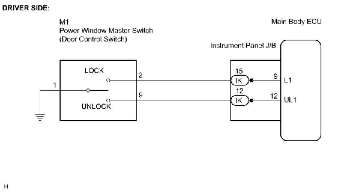 The main body ECU also applies constant voltage to terminal 9 (driver side) or 2 (passenger side) of the door control switch via terminal UL1. When the door control switch is operated to unlock the doors, current flows from terminal UL1 to terminal 9 (driver side) or 2 (passenger side). The main body ECU determines that this is door unlock request signal input.