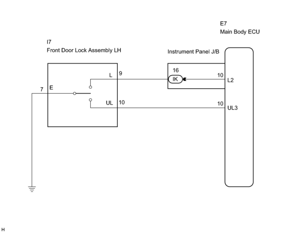 The main body ECU also applies constant voltage to terminal UL of the door lock assembly via terminal UL3. When the door key cylinder is turned in the direction to unlock the door(s) by key, current flows from terminal UL3 to terminal UL.