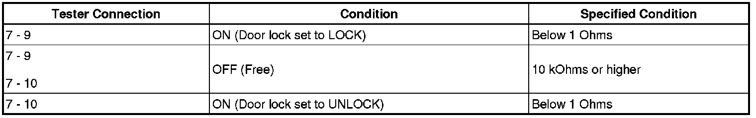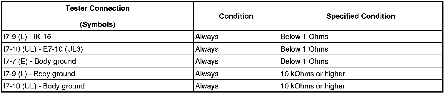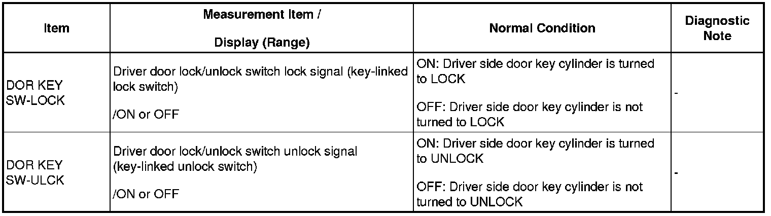 When the driver's door key cylinder is turned to lock all the doors by key, there is continuity between terminals L and E of the key lock and unlock switch. When the cylinder is turned to unlock the door(s), there is continuity between terminals UL and E.