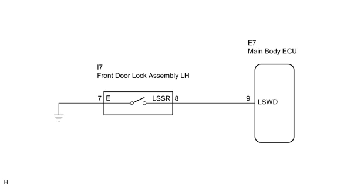 The main body ECU applies voltage to the door unlock detection switch via terminal LSWD. When the door unlock detection switch is on (there is continuity between the switch terminals), a lock state signal is input to the main body ECU. When the switch is off (there is no continuity between the switch terminals), an unlock state signal is input.