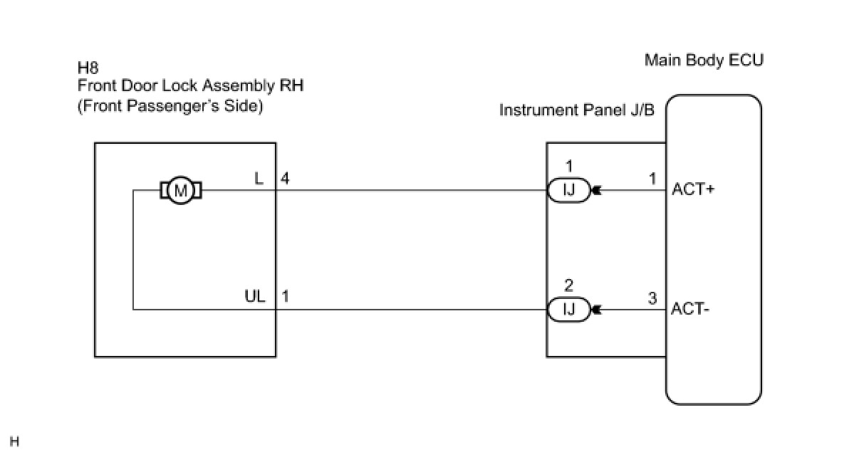 The main body ECU controls the front passenger door lock motor to lock/unlock the front passenger door. This ECU applies current from terminal ACT+ to terminal ACT- to operate the motor to lock the door. It reverses the direction of the current flow to operate the motor to unlock the door.