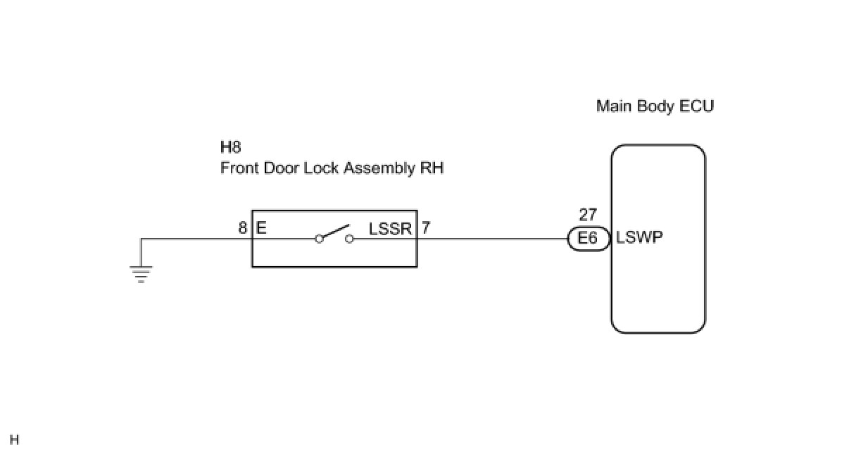 The main body ECU is connected to the front passenger door lock assembly via terminal LSWP and front passenger door lock/unlock state signals are input to the ECU.