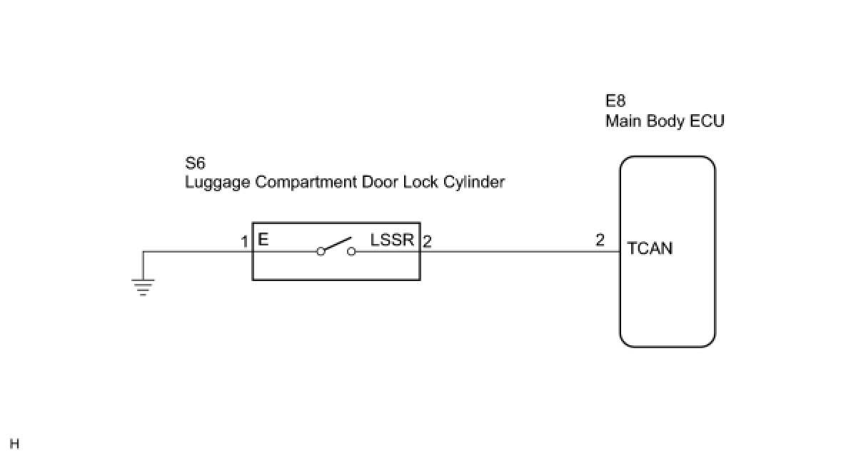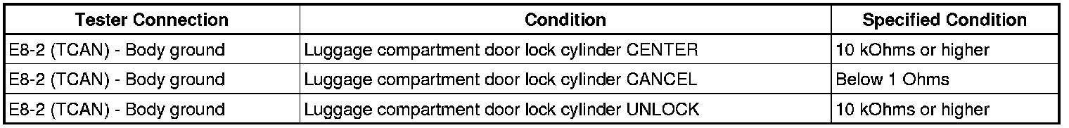 When the luggage compartment door lock cylinder is turned to CANCEL the door by key, there is continuity between terminal TCAN of the main body ECU and body ground.
