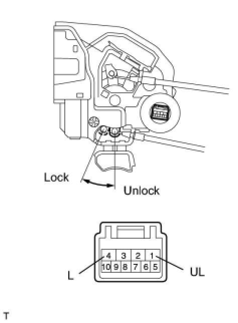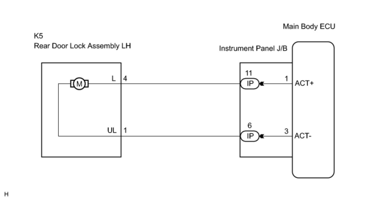 The main body ECU controls the rear left door lock motor to lock/unlock the rear left door. This ECU applies current from terminal ACT+ to terminal ACT- to operate the motor to lock the door. It reverses the direction of the current flow to operate the motor to unlock the door.