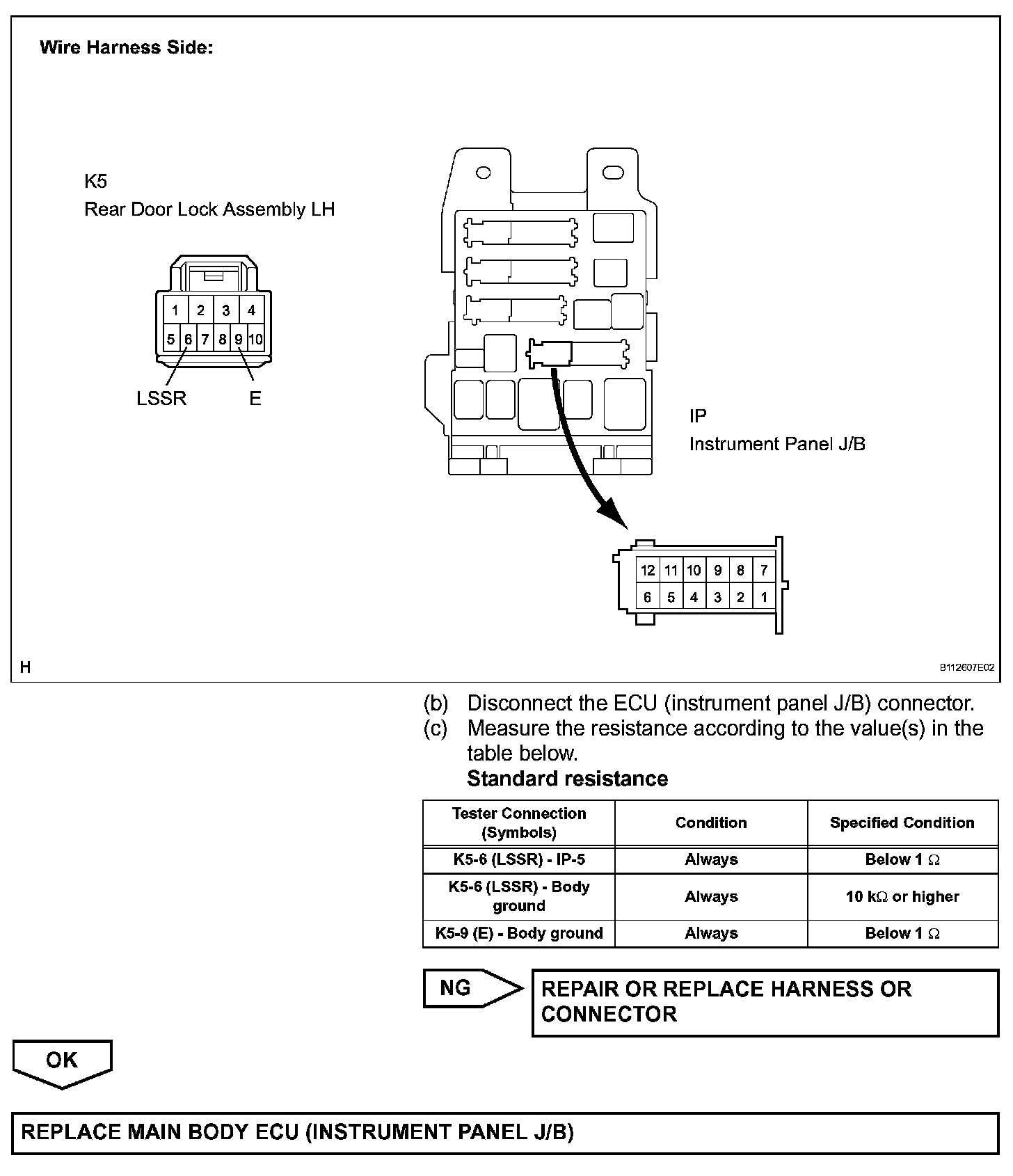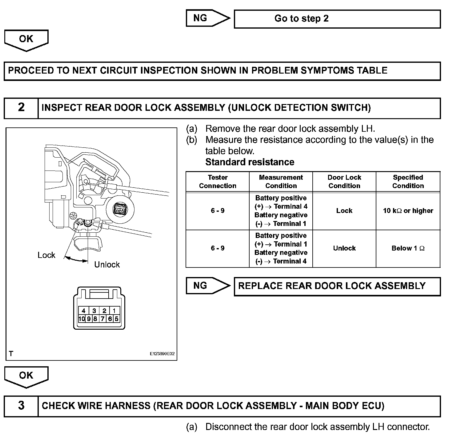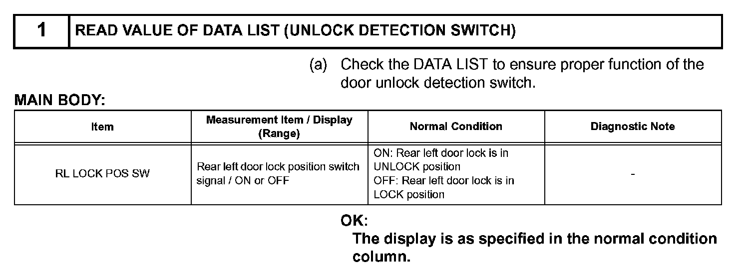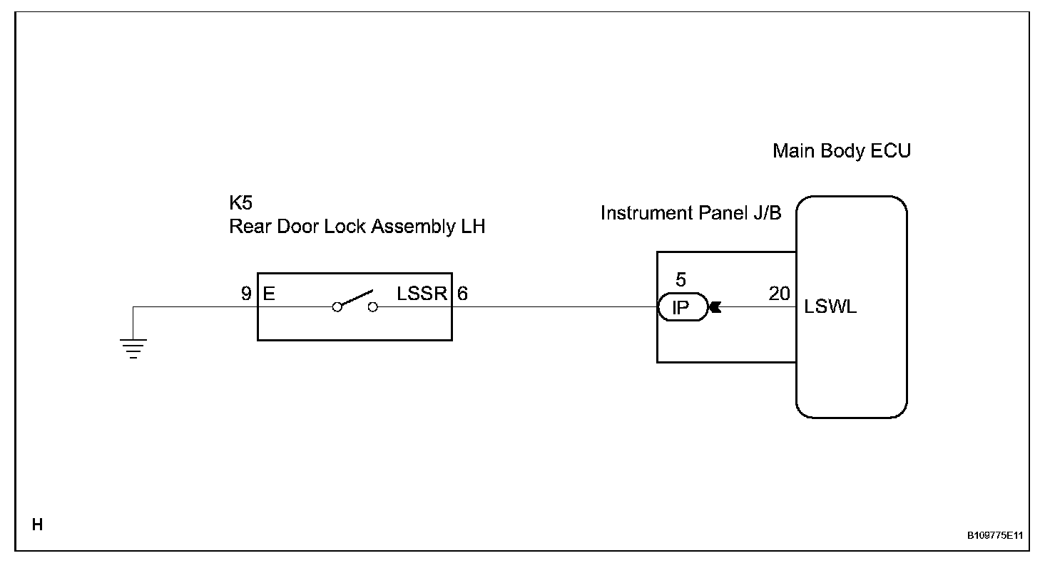 The main body ECU is connected to the rear left door lock assembly via terminal LSWL and rear left side door lock/unlock state signals are input to the ECU.