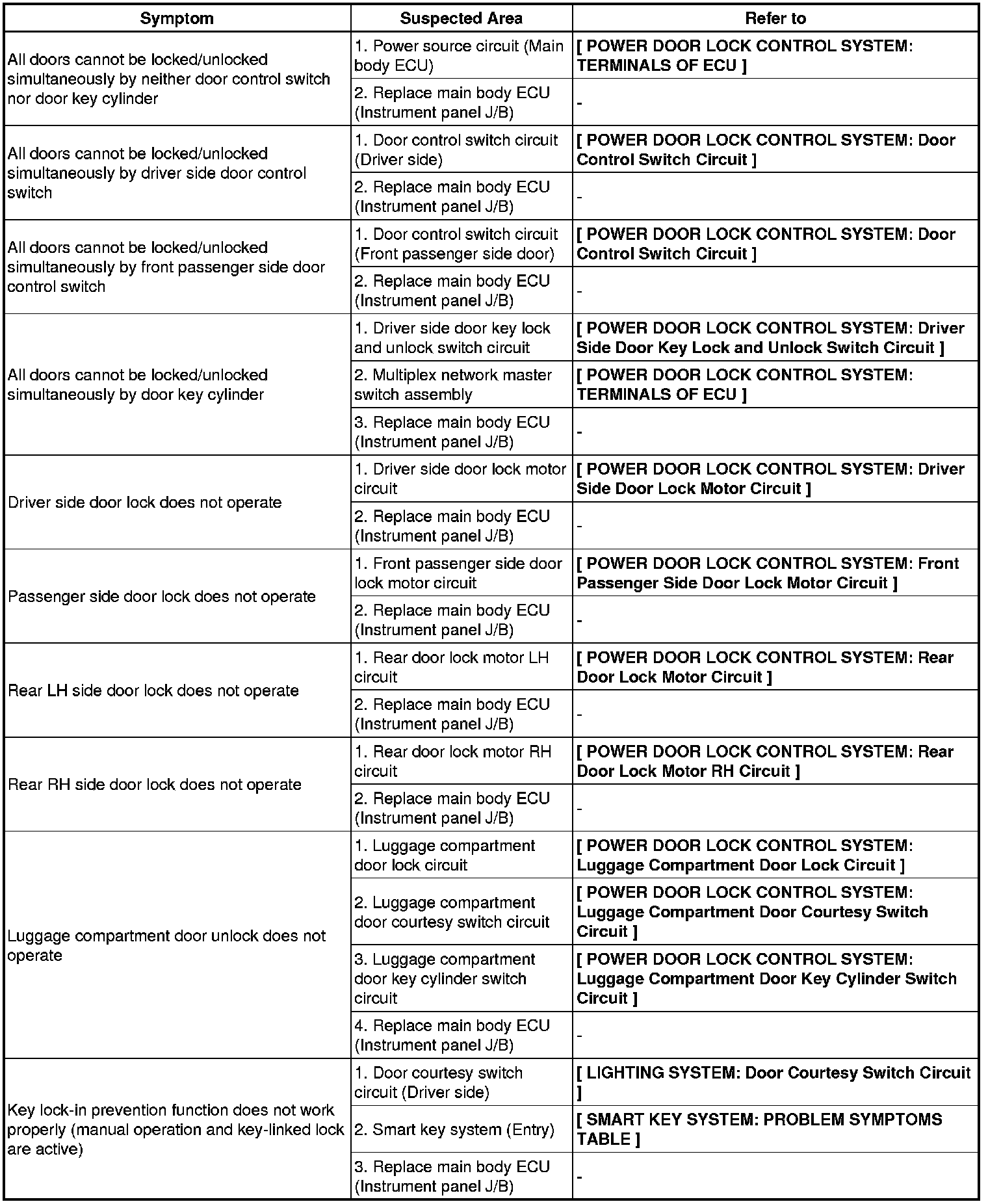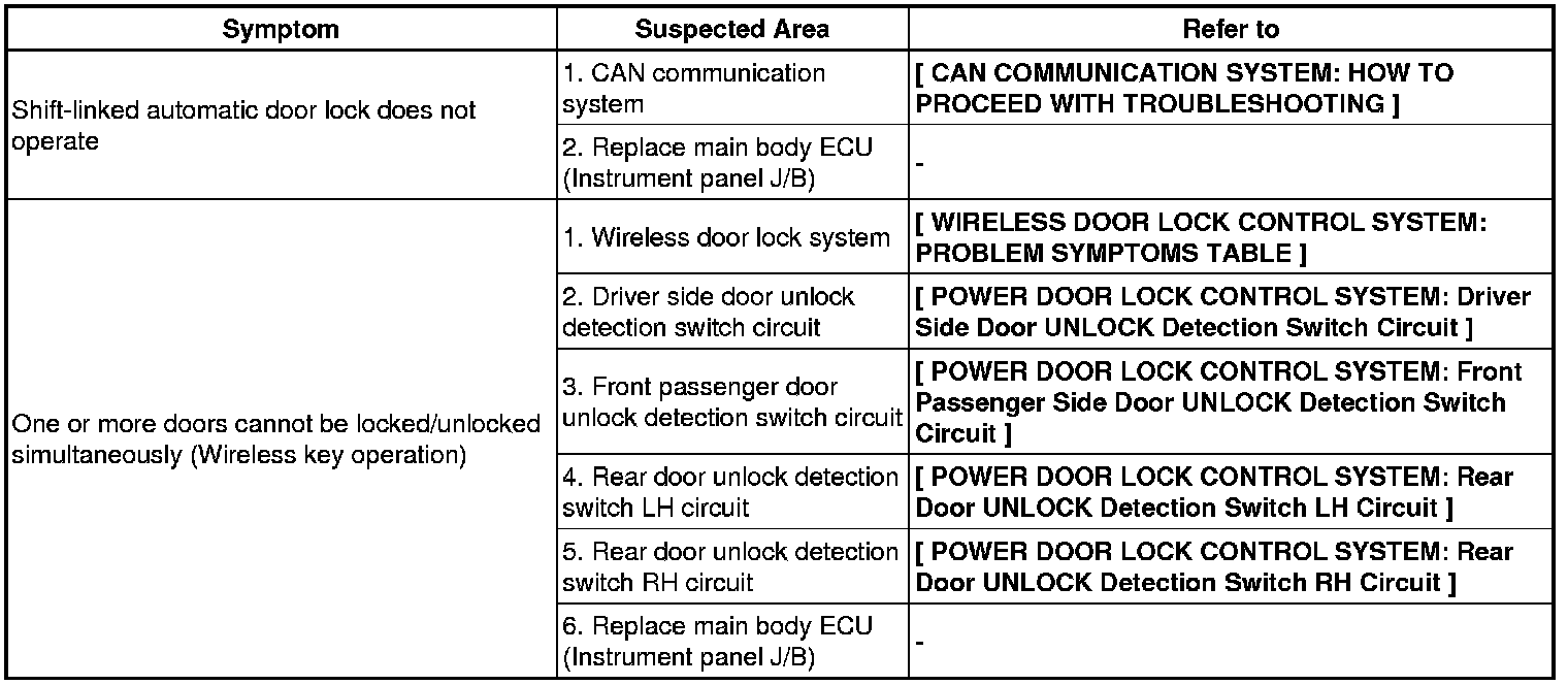 DOOR LOCK: POWER DOOR LOCK CONTROL SYSTEM: PROBLEM SYMPTOMS TABLE