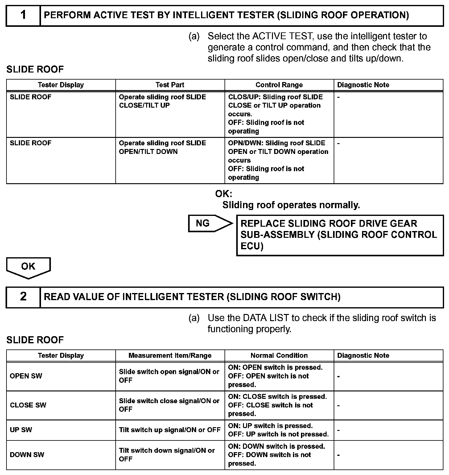 The sliding roof drive gear sub-assembly (sliding roof control ECU) receives slide switch and tilt switch signals and drives its built-in motor.